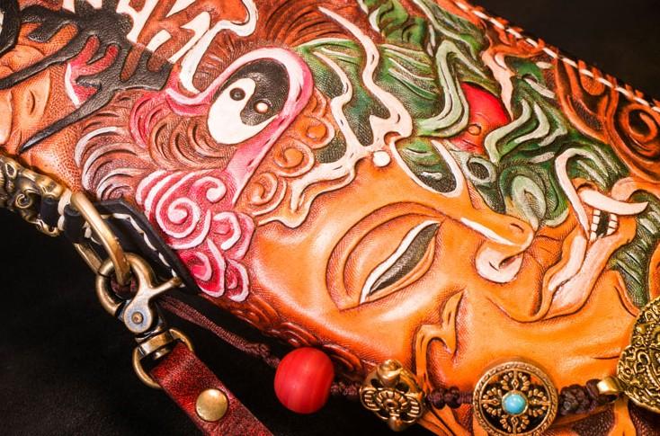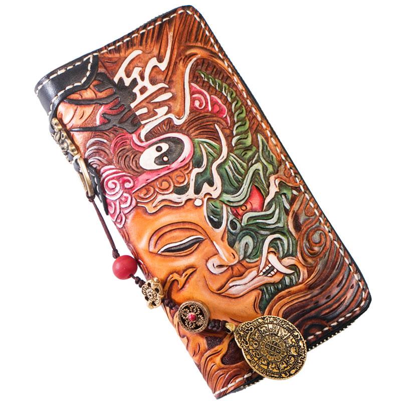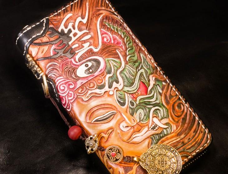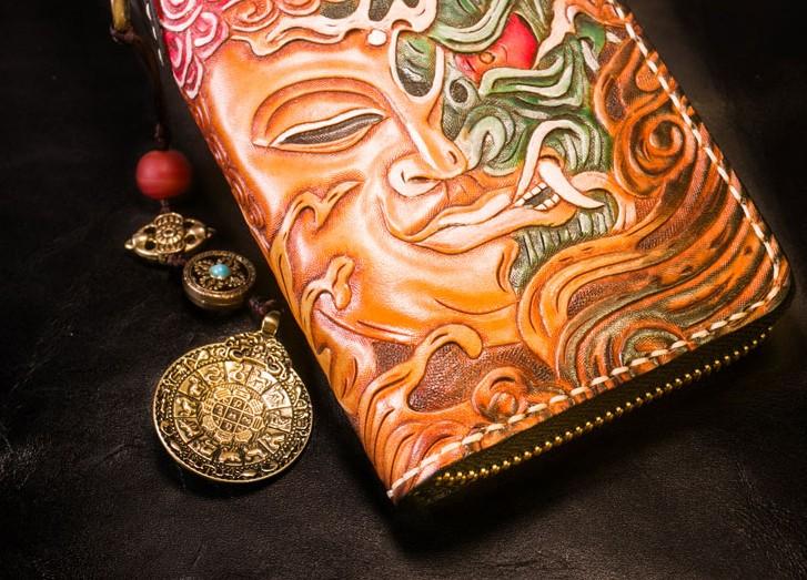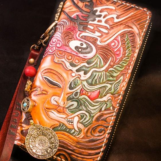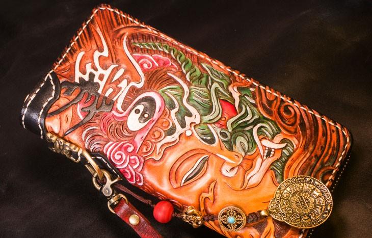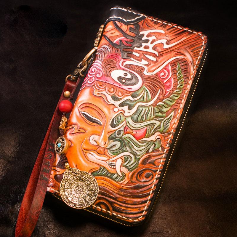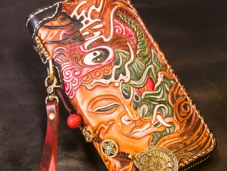 Design: Handmade Leather Tooled Buddha Mens Chain Biker Wallet Cool Leather Wallet Long Phone Wallets for Men