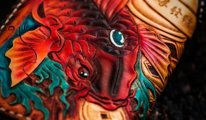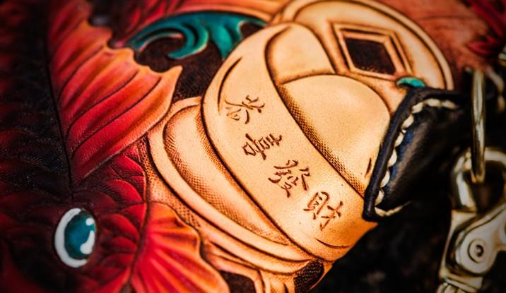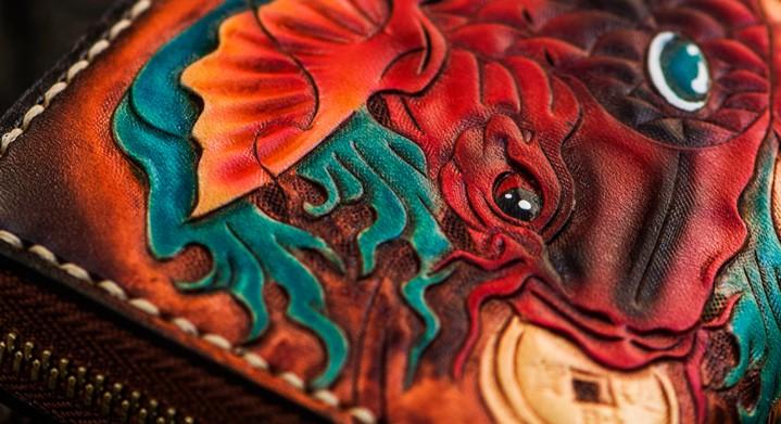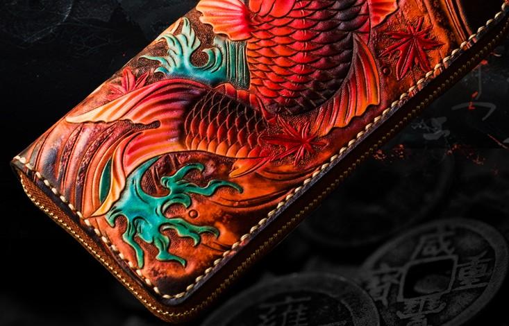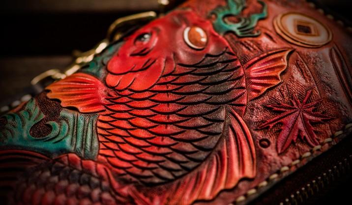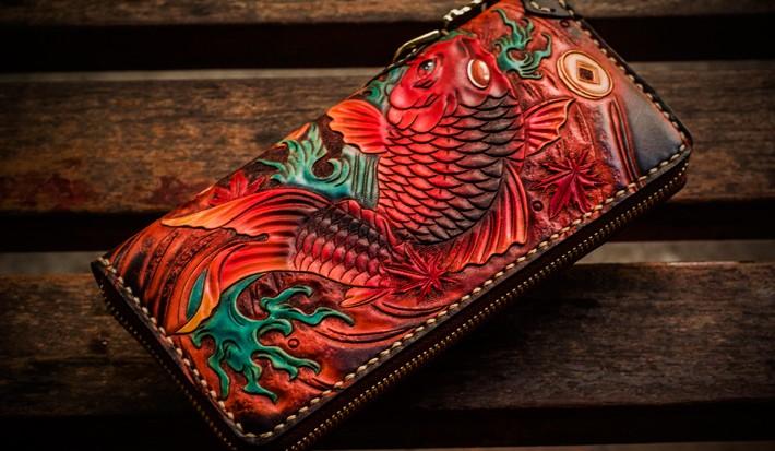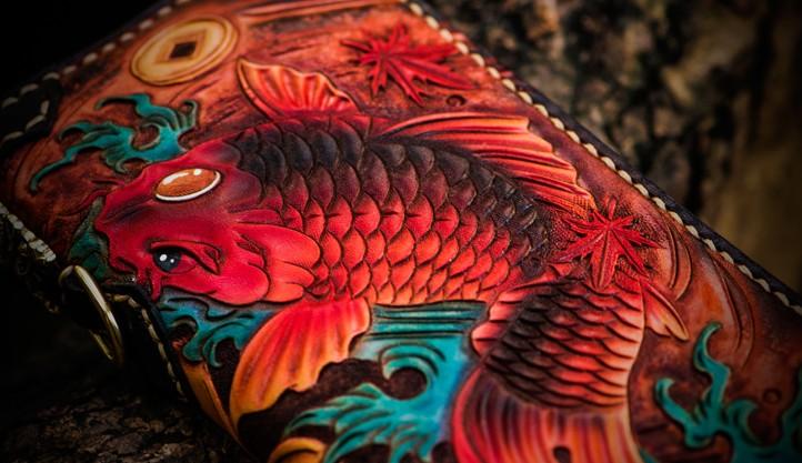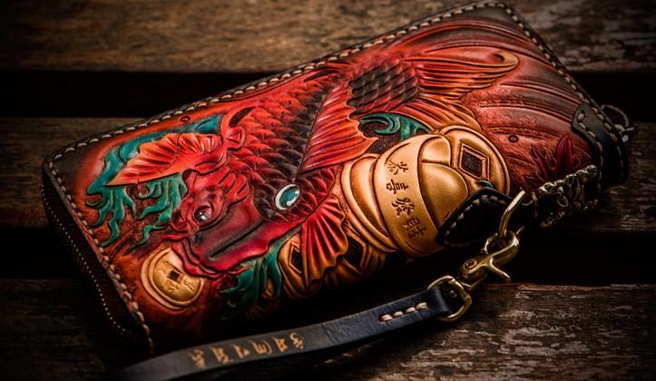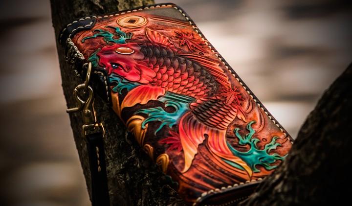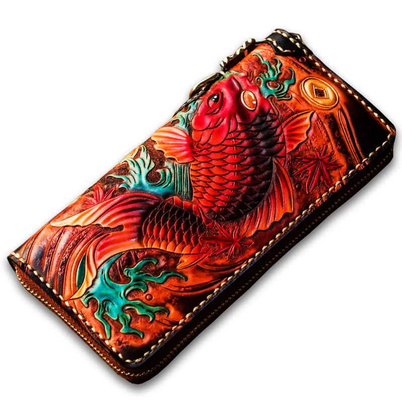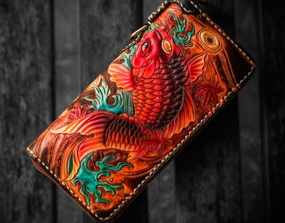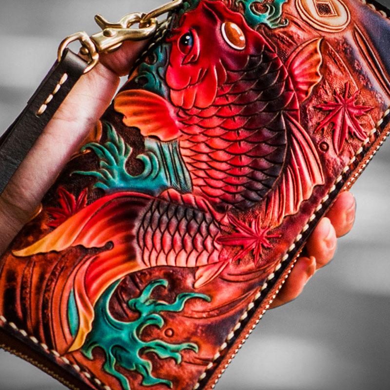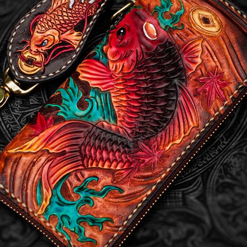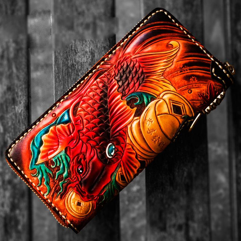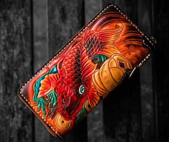 Design: Handmade Leather Tooled Carp Mens Chain Biker Wallet Cool Leather Wallet Long Phone Wallets for Men