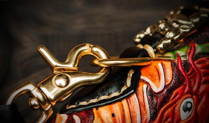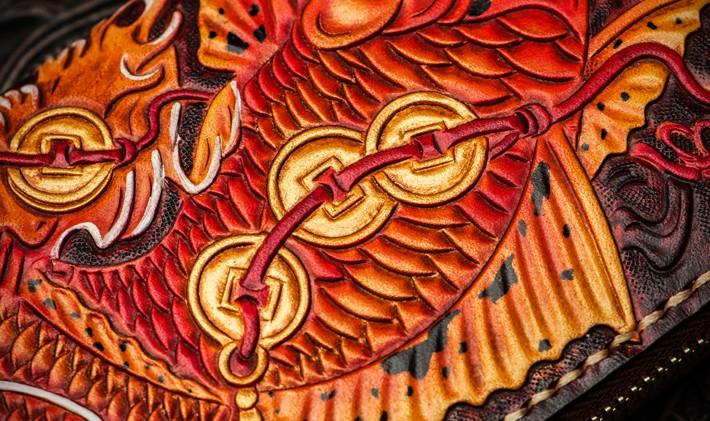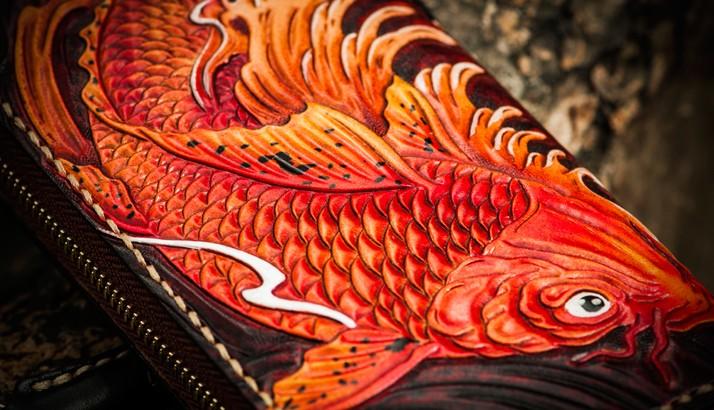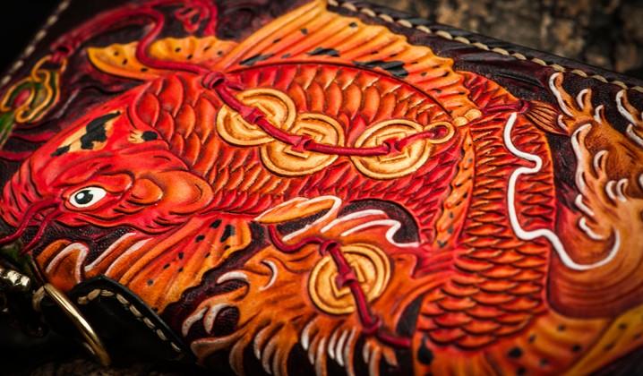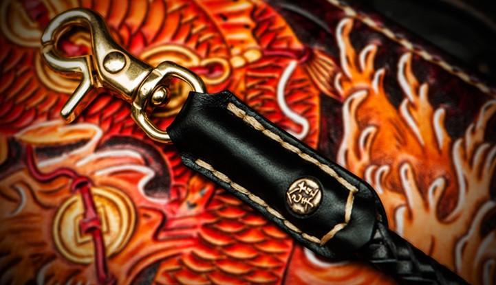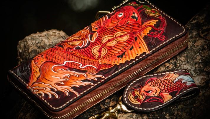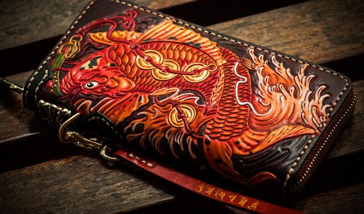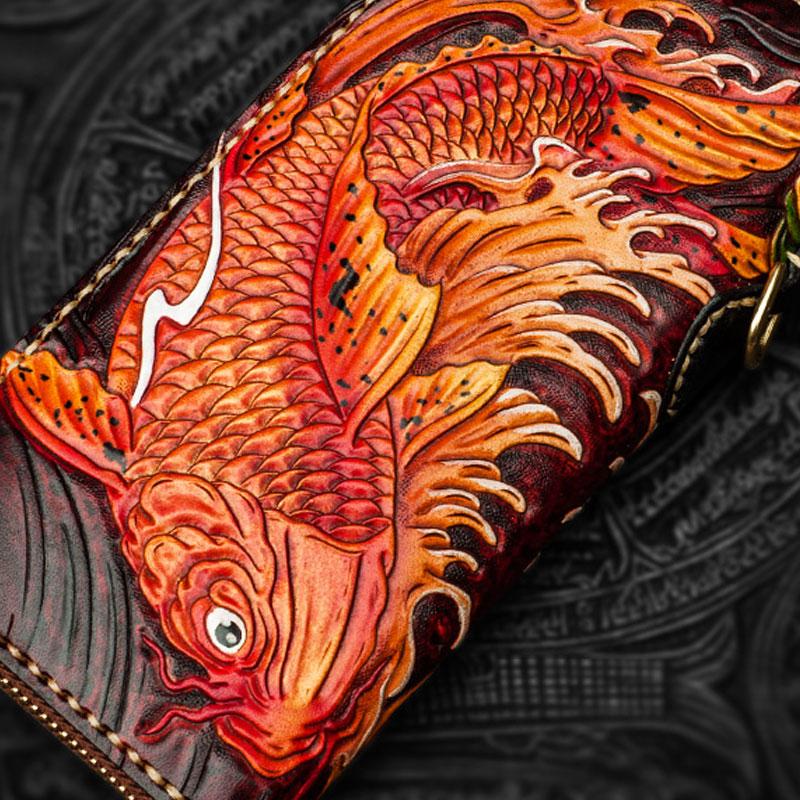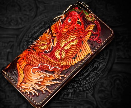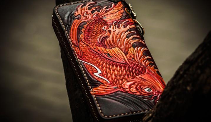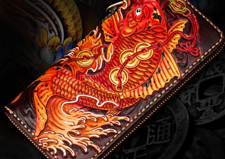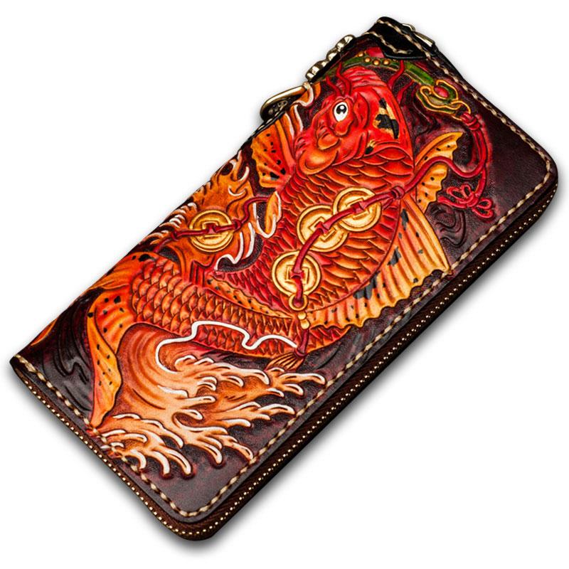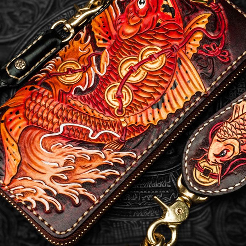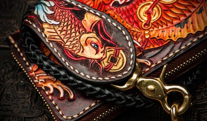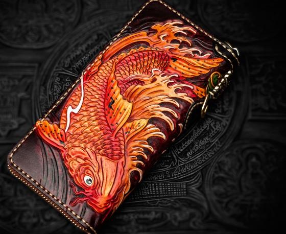 Design: Handmade Leather Tooled Carp Mens Chain Biker Wallet Cool Leather Wallet Long Phone Wallets for Men