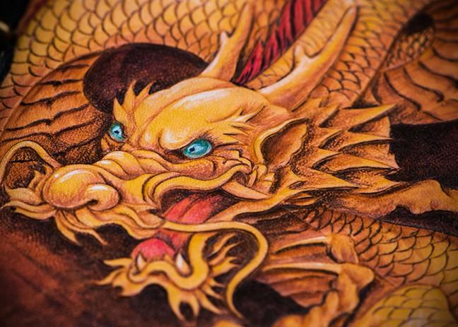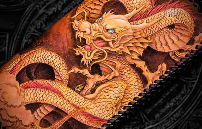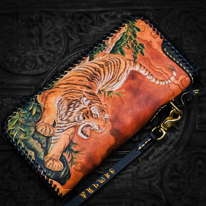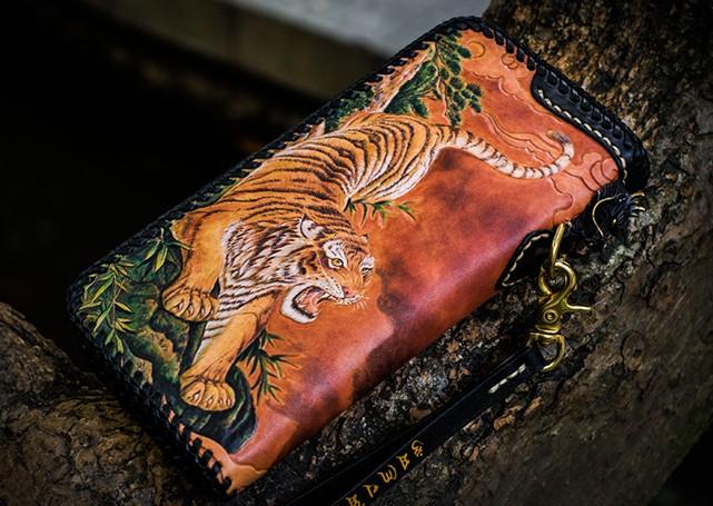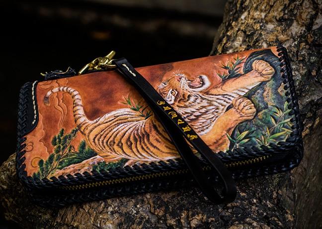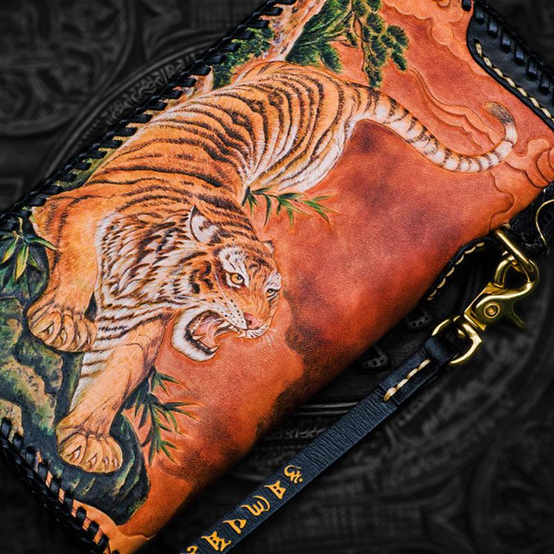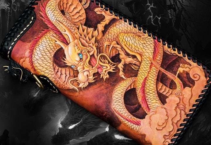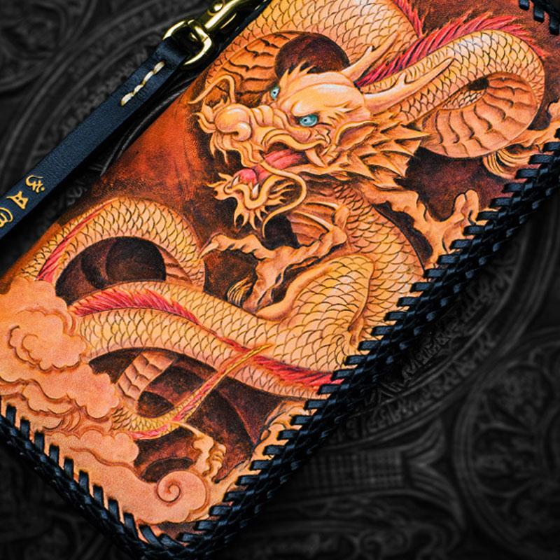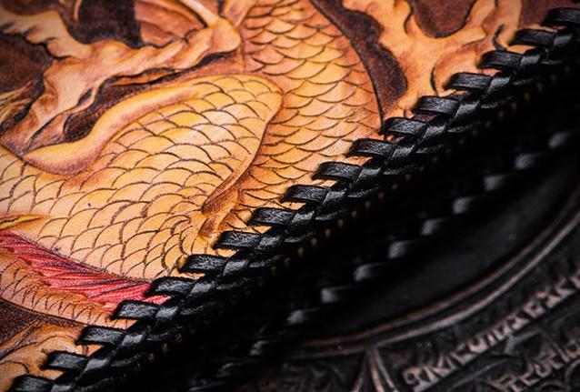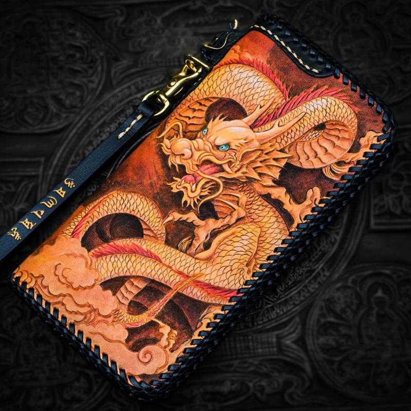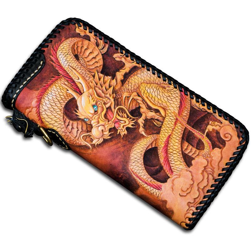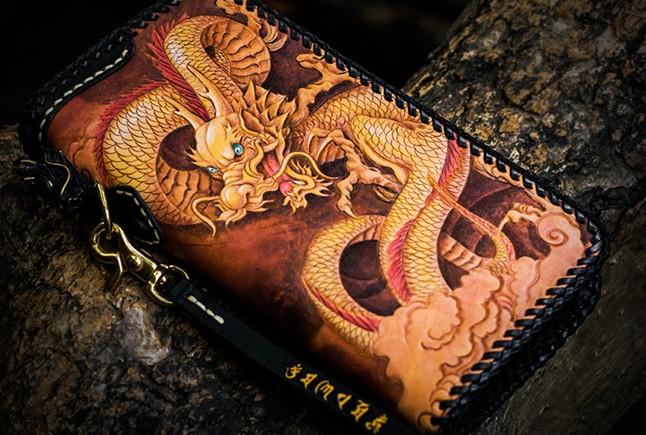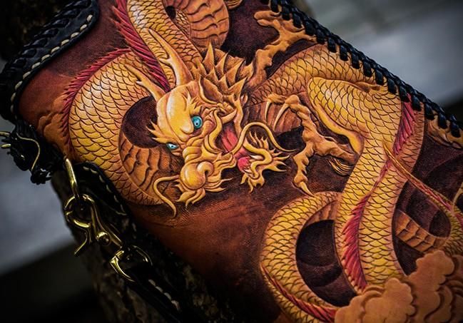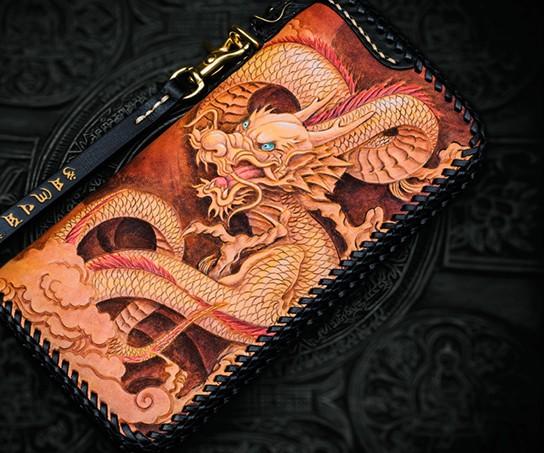 Design: Handmade Leather Tooled Chinese Dragon Chain Wallet Mens Biker Wallet Cool Leather Wallet Long Phone Wallets for Men