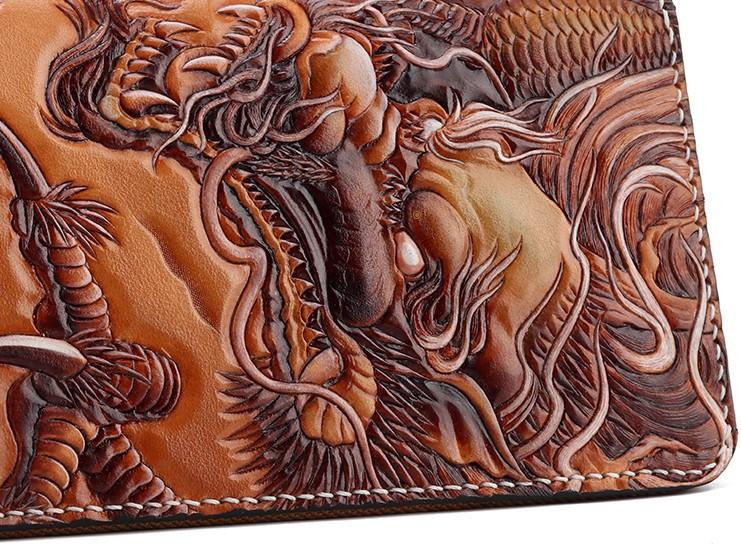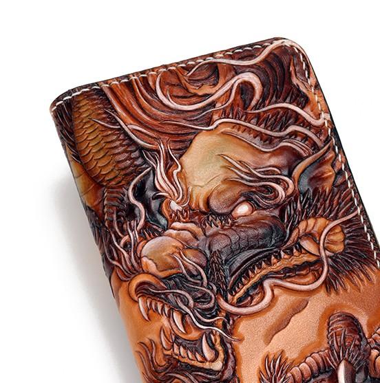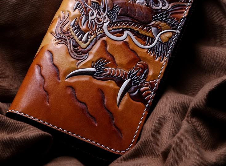 Design: Handmade Leather Tooled Chinese Dragon Tiger Mens Chain Biker Wallet Cool Leather Wallet Zipper Long Phone Wallets for Men