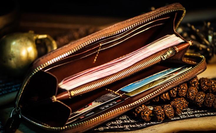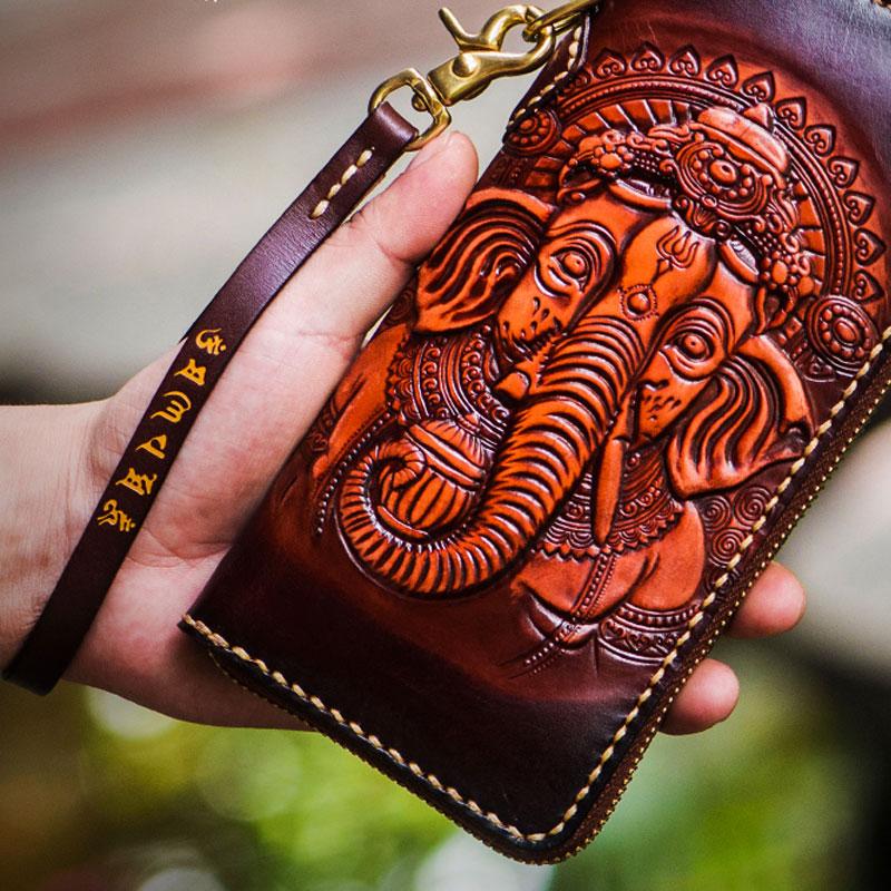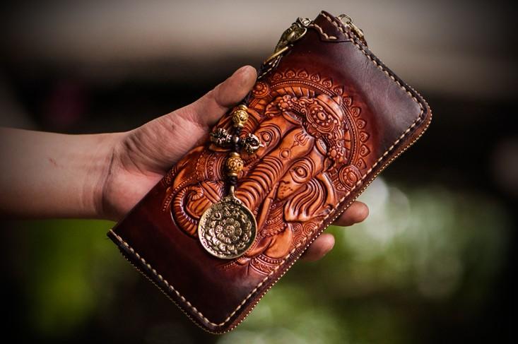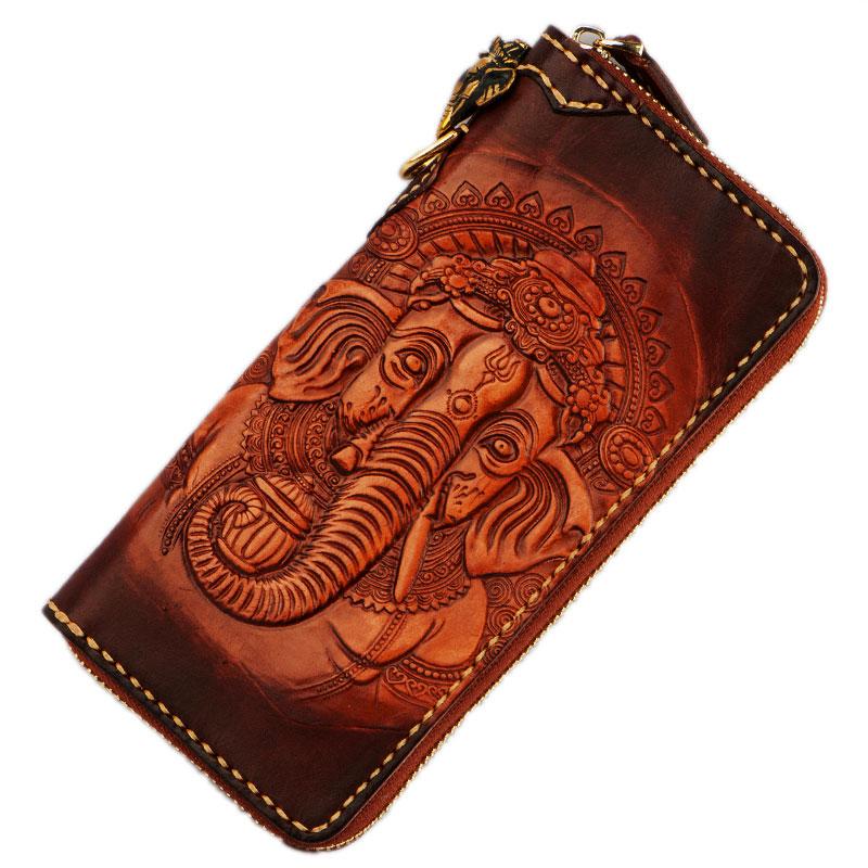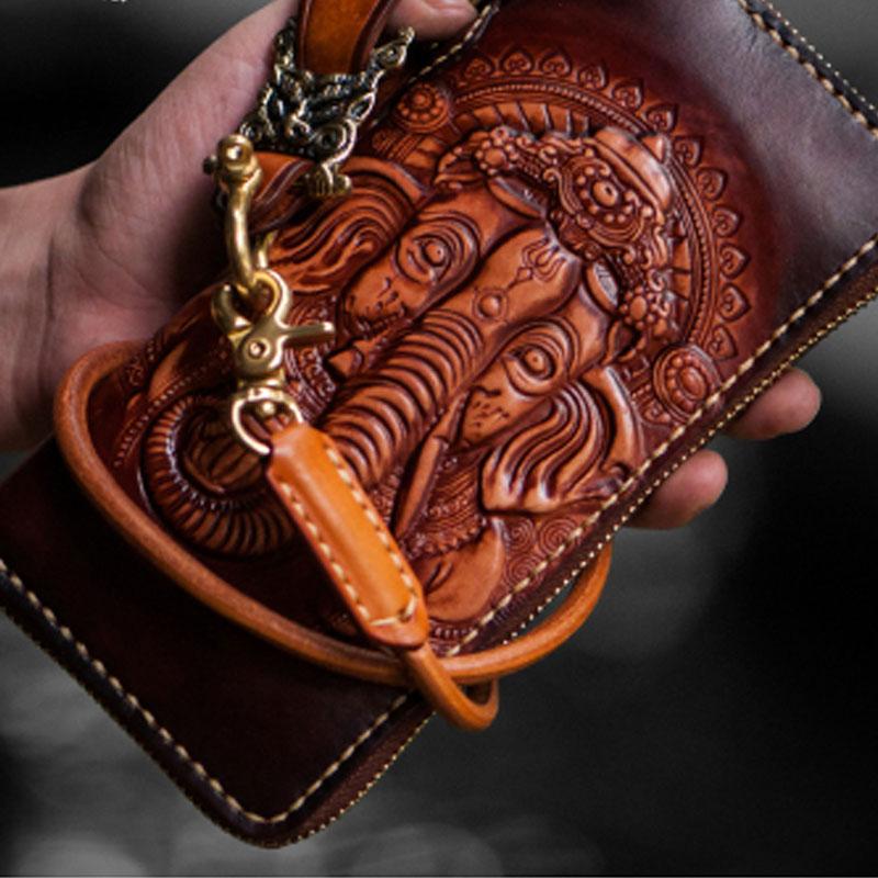 Design: Handmade Leather Tooled Ganesh Mens Chain Biker Wallet Cool Leather Wallet Zipper Long Phone Wallets for Men