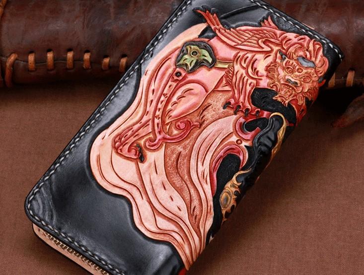 Design: Handmade Leather Tooled Monster Mens Chain Biker Wallet Cool Leather Wallet Zipper Long Phone Wallets for Men