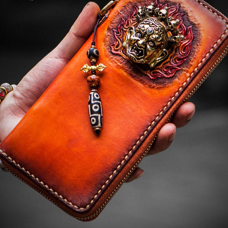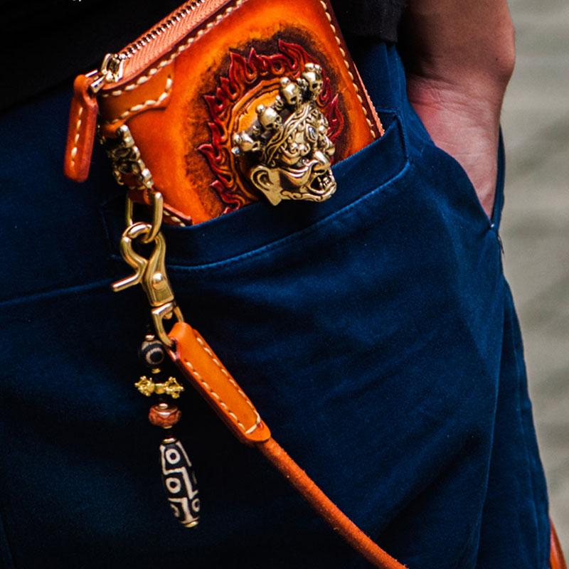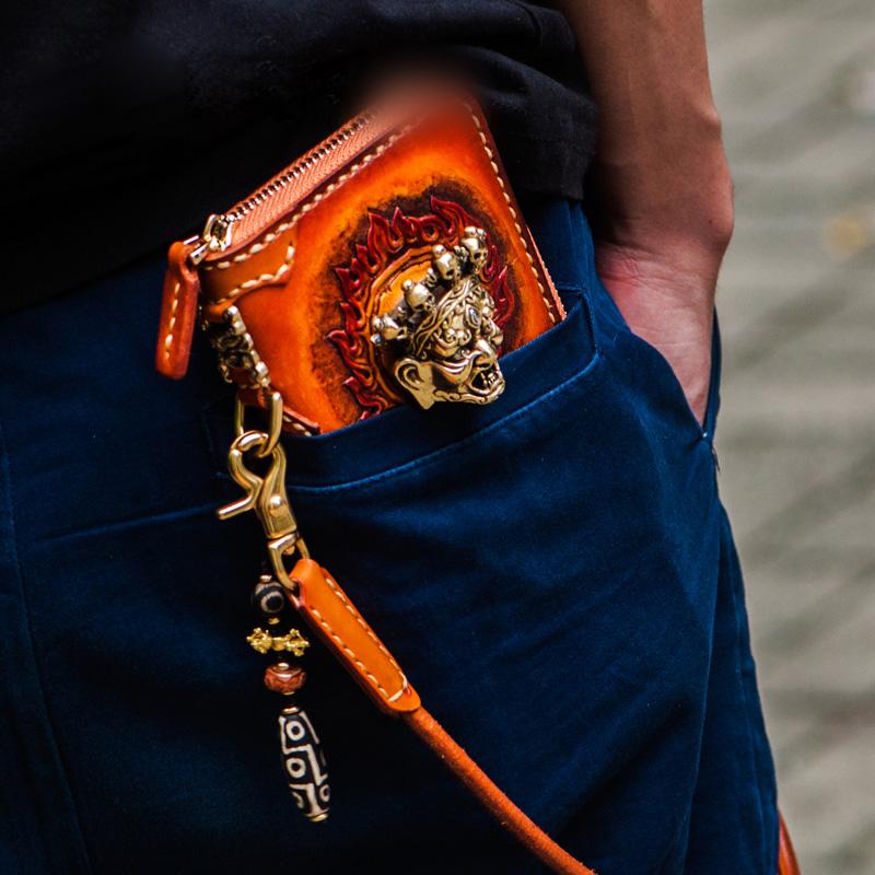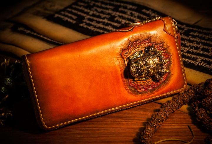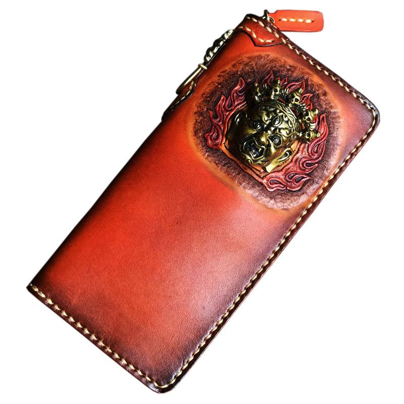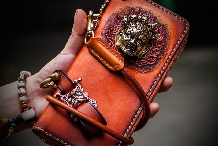 Design: Handmade Leather Tooled Tibetan Mens Chain Biker Wallet Cool Leather Wallet Long Clutch Wallets for Men