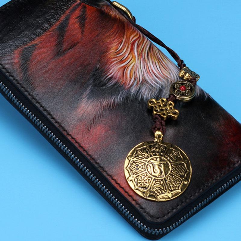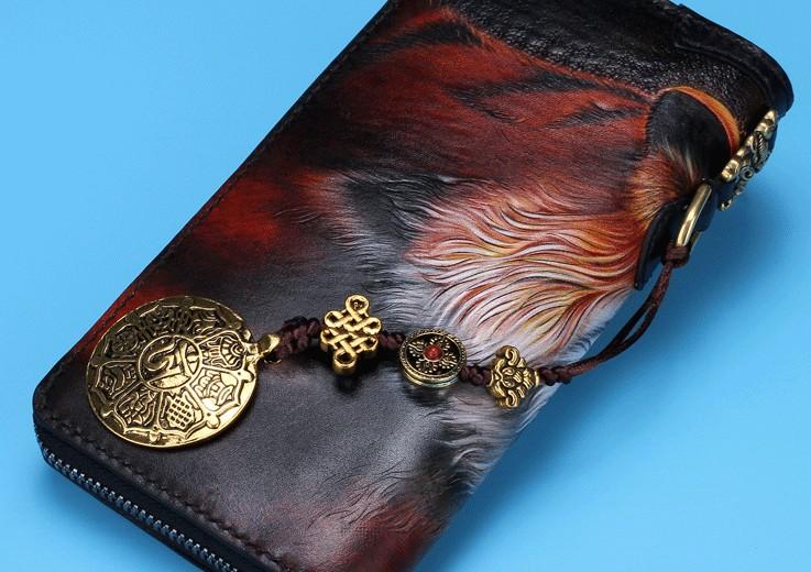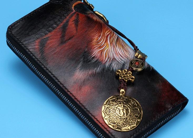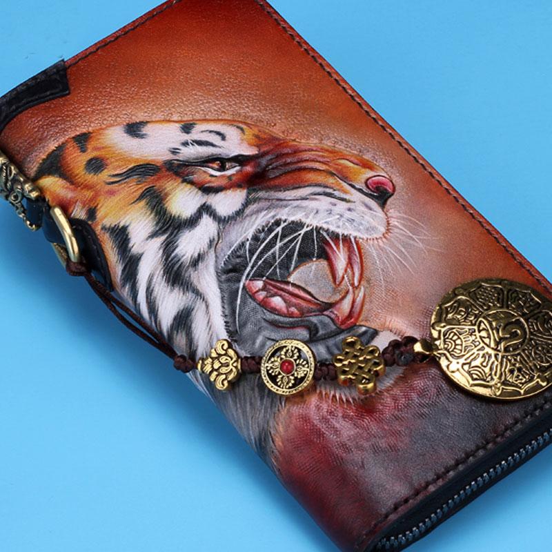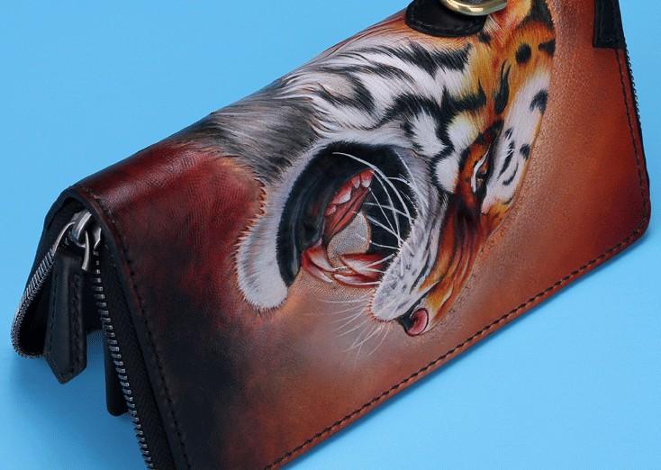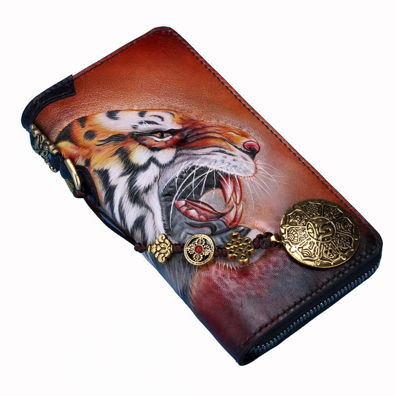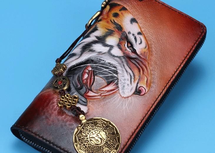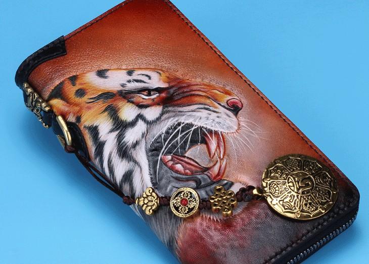 Design: Handmade Leather Tooled Tiger Mens Chain Biker Wallet Cool Leather Wallet Long Clutch Wallets for Men