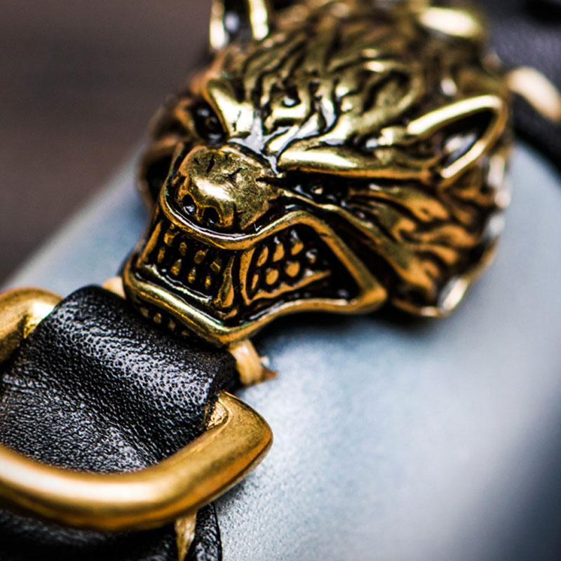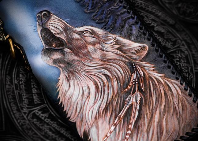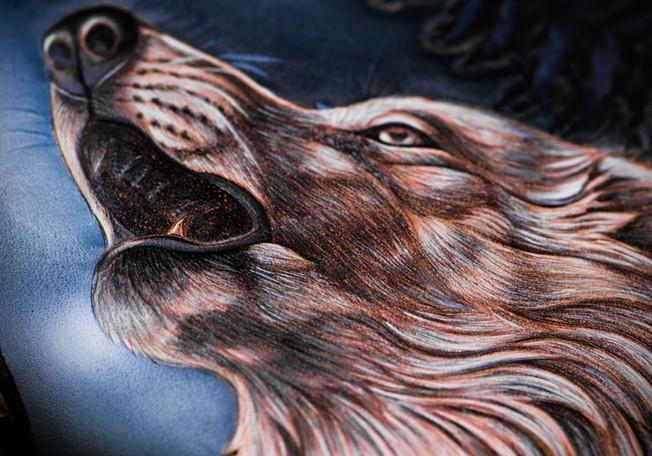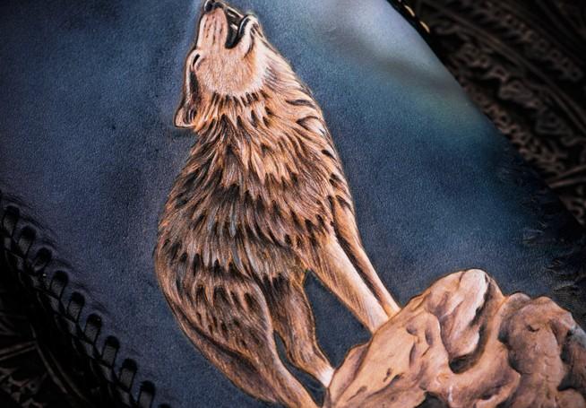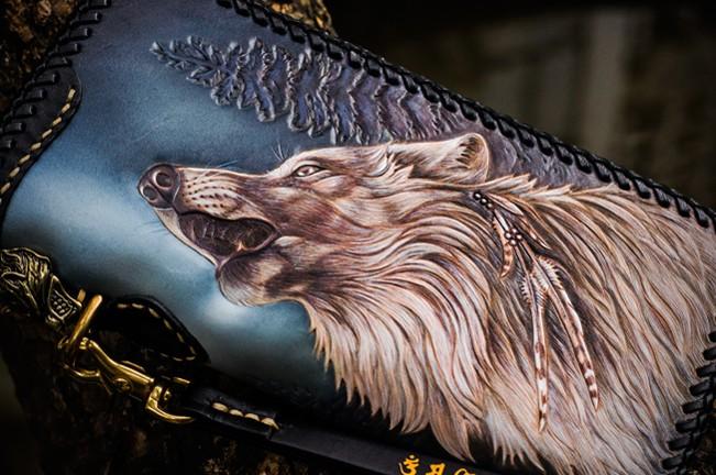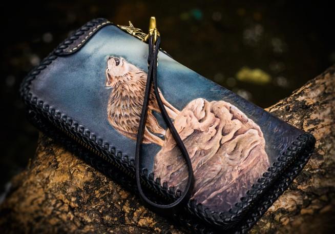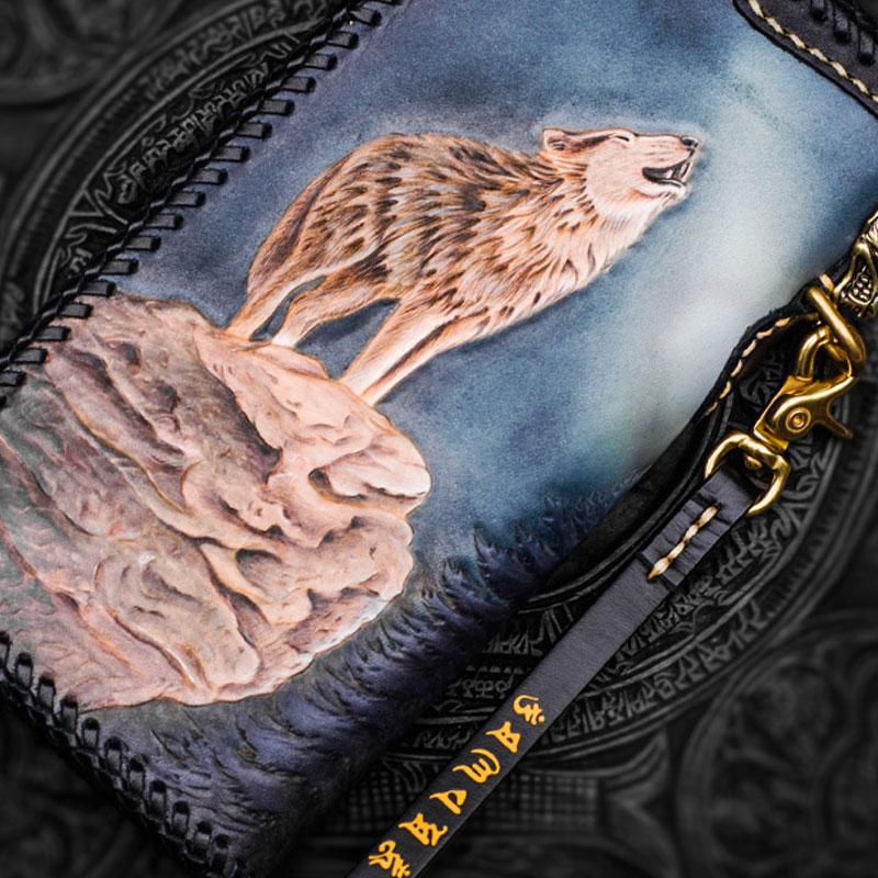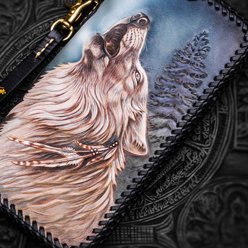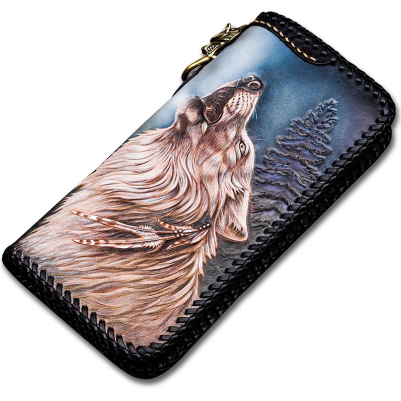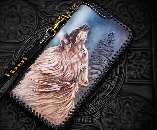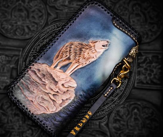 Style: Handmade Leather Tooled Wolf Chain Wallet Mens Biker Wallet Cool Leather Wallet Long Phone Wallets for Men