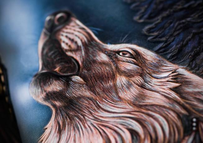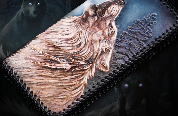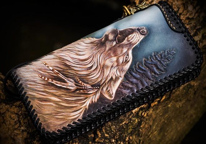 Design: Handmade Leather Tooled Wolf Chain Wallet Mens Biker Wallet Cool Leather Wallet Long Phone Wallets for Men