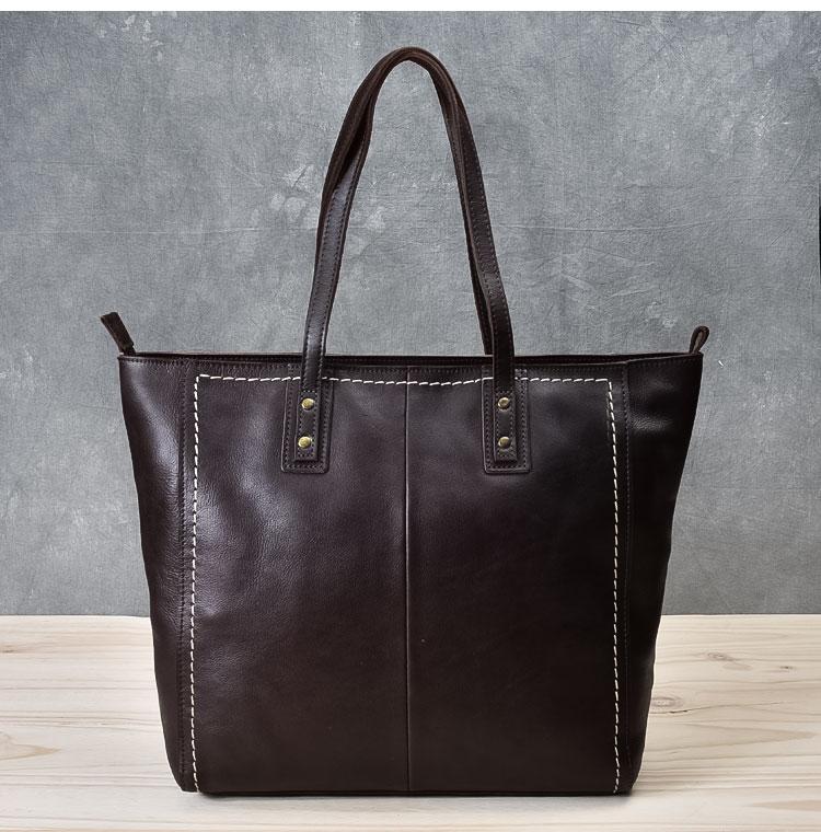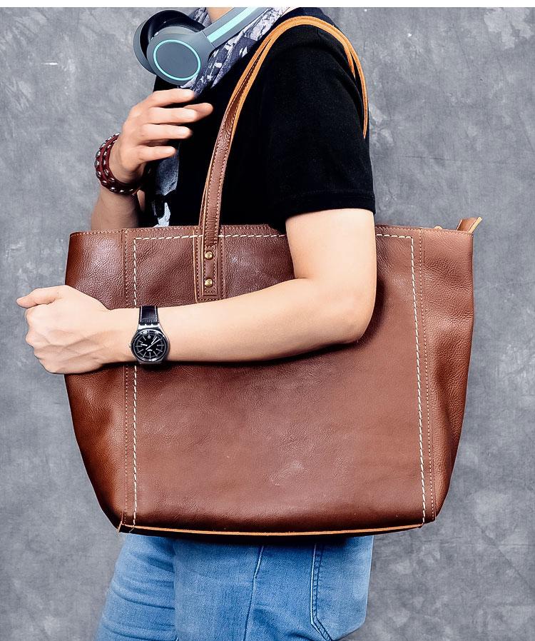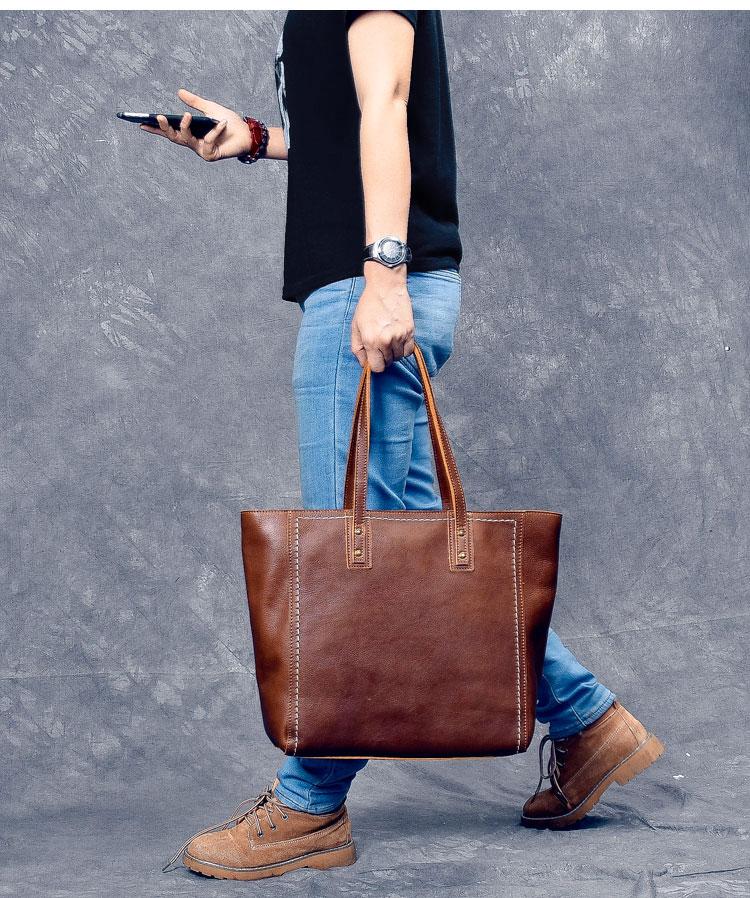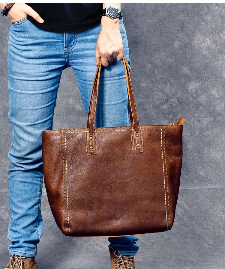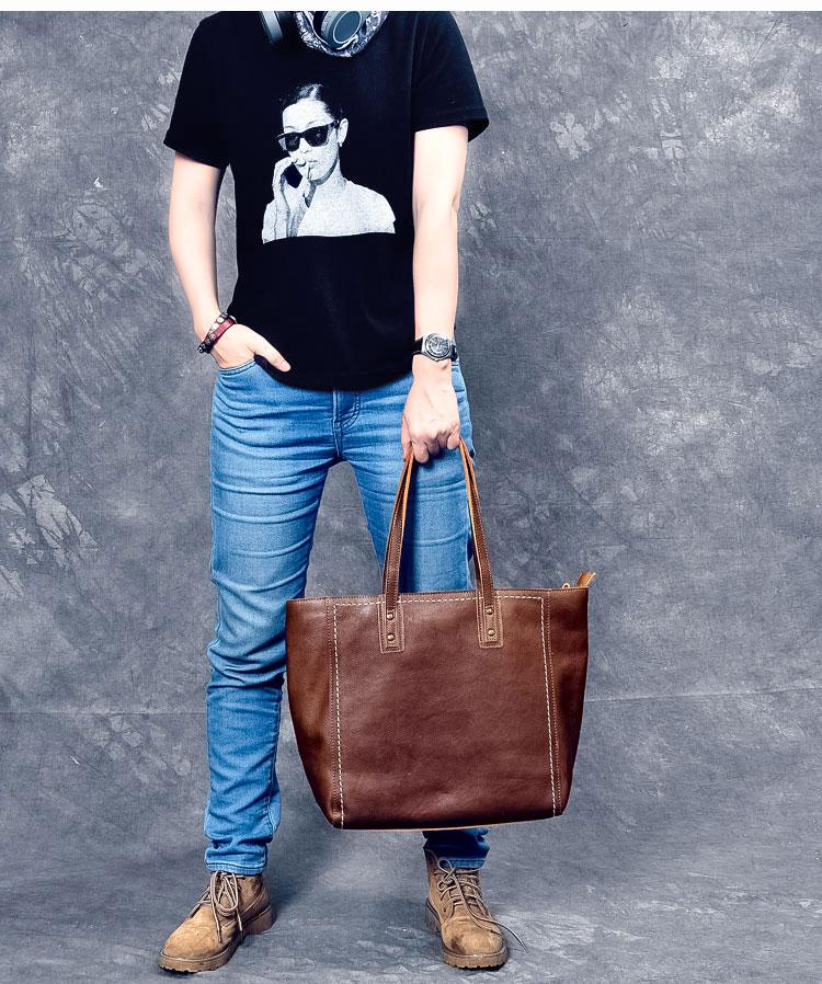 Design: Leather Mens Womens 15" Large Shoulder Bag Brown Tote Bag Large Side Bag Dark Coffee Handbag For Men