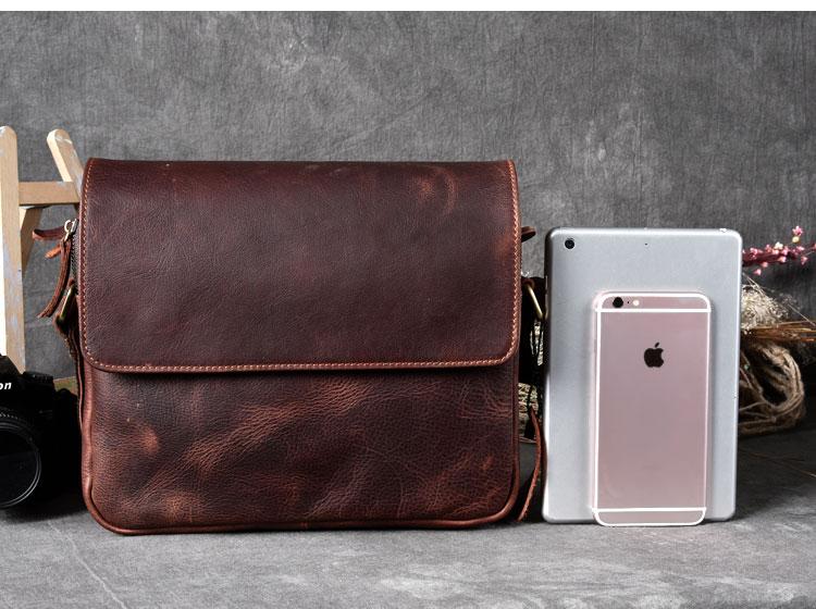 Design: Leather Mens 8‘’ Red Brown Small Side Bag Retro Messenger Bag Shoulder Bag For Men
