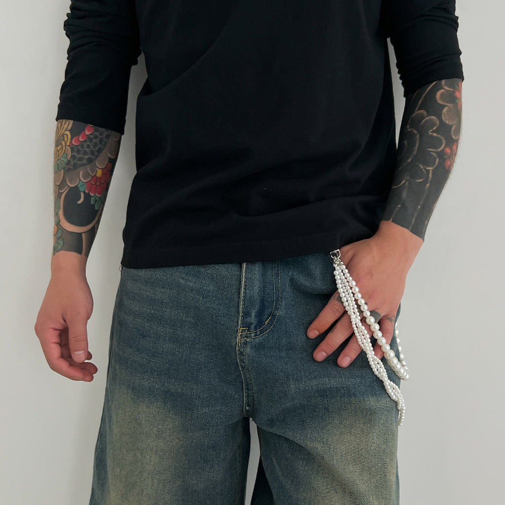 Introduce a bold and textured statement to your wardrobe with the Pearl Wallet Chain, a meticulously crafted accessory that celebrates the art of layering. This unique Ball Wallet Chain features four interwoven strands of faux pearls: one 48cm strand of larger statement pearls paired with three 56cm strands of smaller pearls, all intricately twisted together to create a voluminous, eye-catching look. From a distance, the design flows with a unified pearlescent glow, but a closer look reveals the dynamic contrast in bead sizes and the carefully entangled construction—a detail that adds depth, movement, and a handcrafted feel. This versatile Beaded Pants Chain is designed for those who love to mix softness with structure, offering a look that transitions effortlessly from subculture grit to everyday elegance.