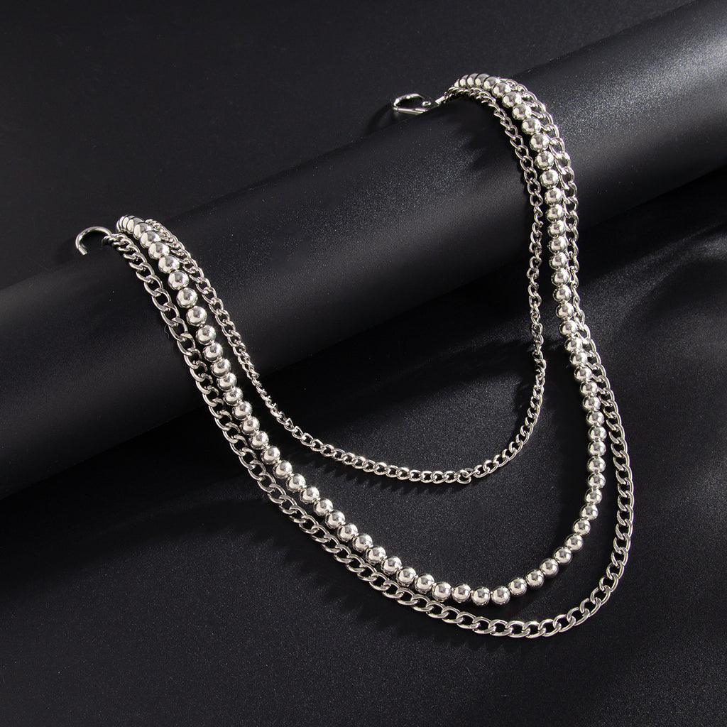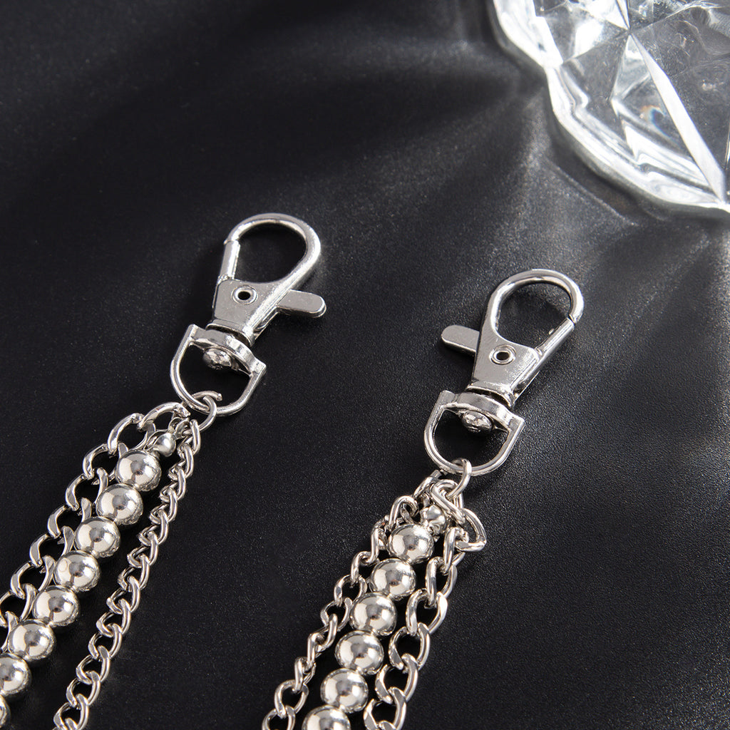 Introduce a bold and textured statement to your wardrobe with the Pearl Wallet Chain, a meticulously crafted accessory that celebrates the art of layering. This unique Ball Wallet Chain features four interwoven strands of faux pearls: one 48cm strand of larger statement pearls paired with three 56cm strands of smaller pearls, all intricately twisted together to create a voluminous, eye-catching look. From a distance, the design flows with a unified pearlescent glow, but a closer look reveals the dynamic contrast in bead sizes and the carefully entangled construction—a detail that adds depth, movement, and a handcrafted feel. This versatile Beaded Pants Chain is designed for those who love to mix softness with structure, offering a look that transitions effortlessly from subculture grit to everyday elegance.