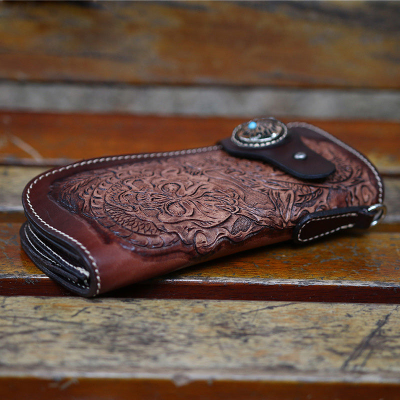 Design: Cool Leather Tooled Dragon&Skull Biker Wallet Handmade Biker Chain Wallet for Men