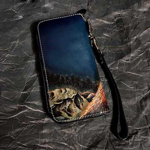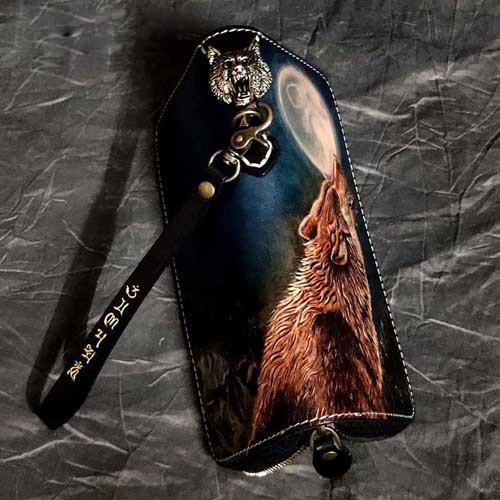 Style: Badass Black Leather Men's Long Biker Handmade Wallet Wolf Tooled Zipper Long Wallets For Men