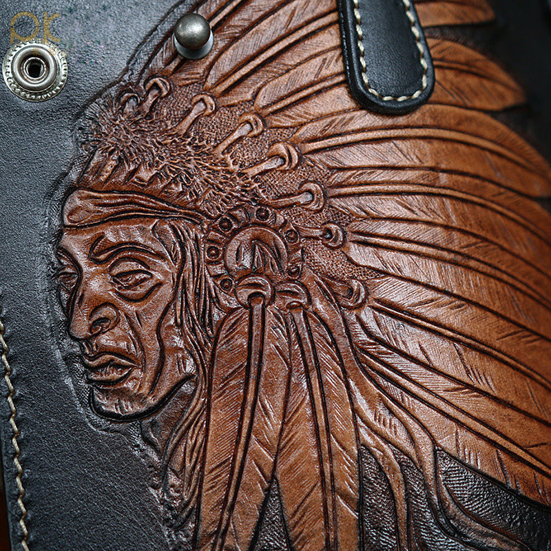 Style: Handmade Leather Tooled Indian Chief Mens Chain Biker Wallet Cool Leather Wallet Long Wallet for Men