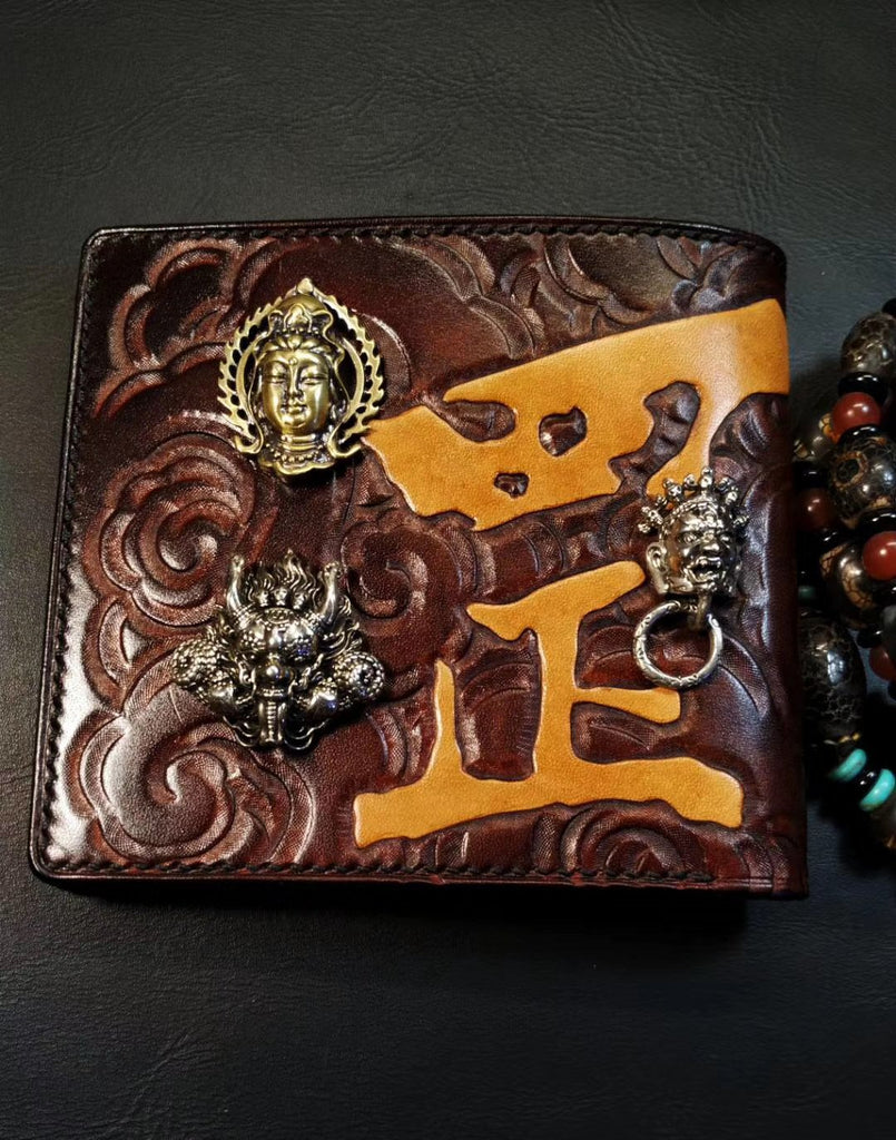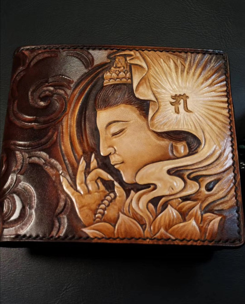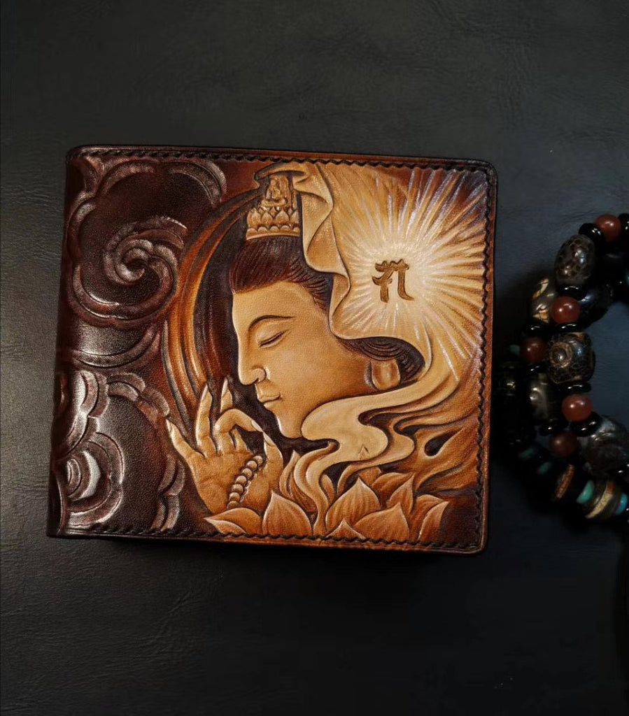 Style: Handmade Leather Avalokitesvara Tooled Mens billfold Wallet Cool Leather Wallet Slim Wallet for Men