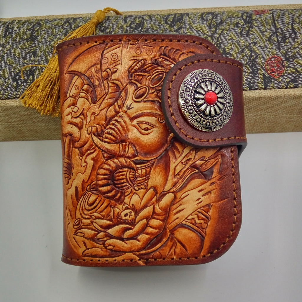 Style: Handmade Leather Tooled Ganesha Mens Chain Biker Wallet Cool Leather Wallet Small Wallets for Men
