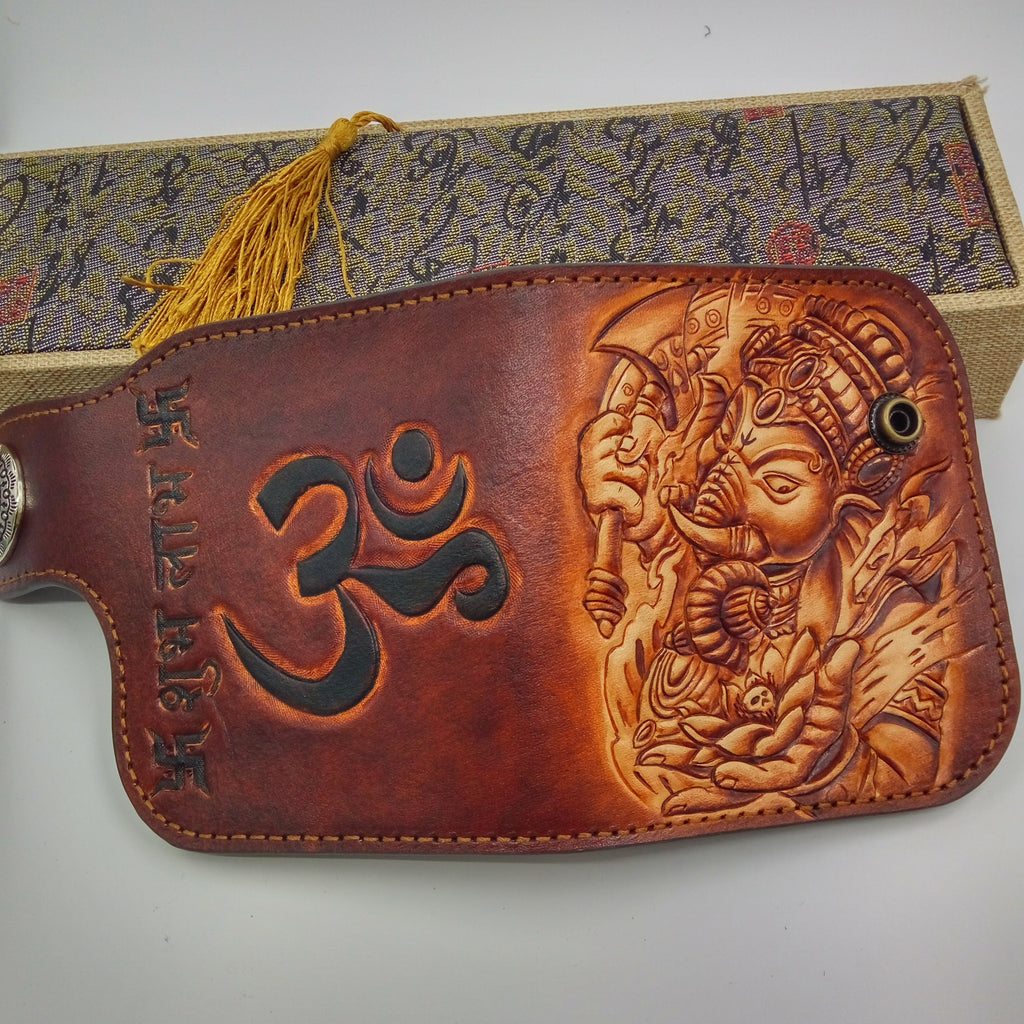 Design: Handmade Leather Tooled Ganesha Mens Chain Biker Wallet Cool Leather Wallet Small Wallets for Men
