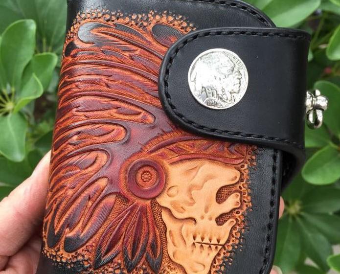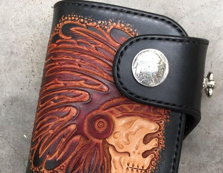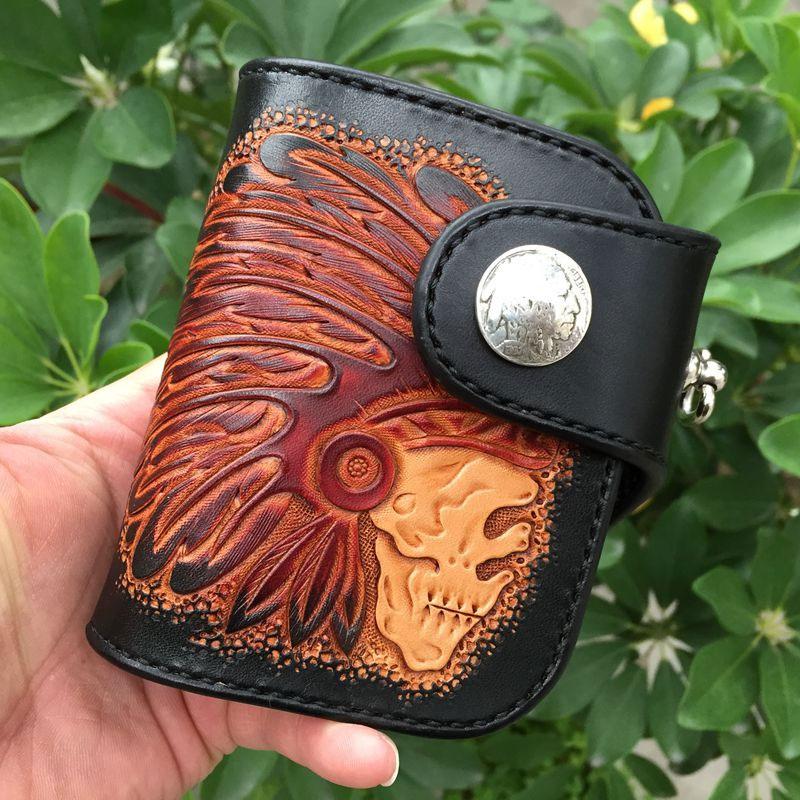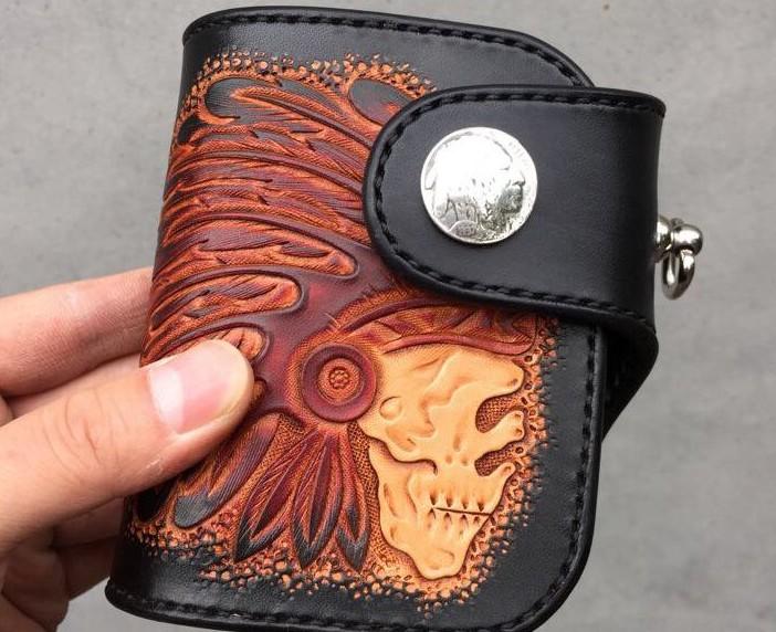 Design: Handmade Leather Tooled Skull Indian Chief Biker Wallet Mens Cool billfold Chain Wallet Trucker Wallet with Chain