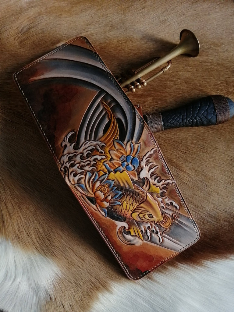 Koi ID Holder Wallet Mens Wallet with ID Window Carp Tooled Leather Wallet Card Wallet with ID Window