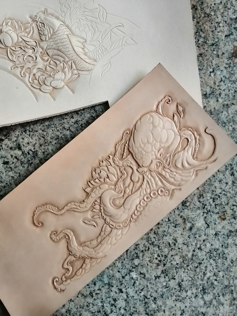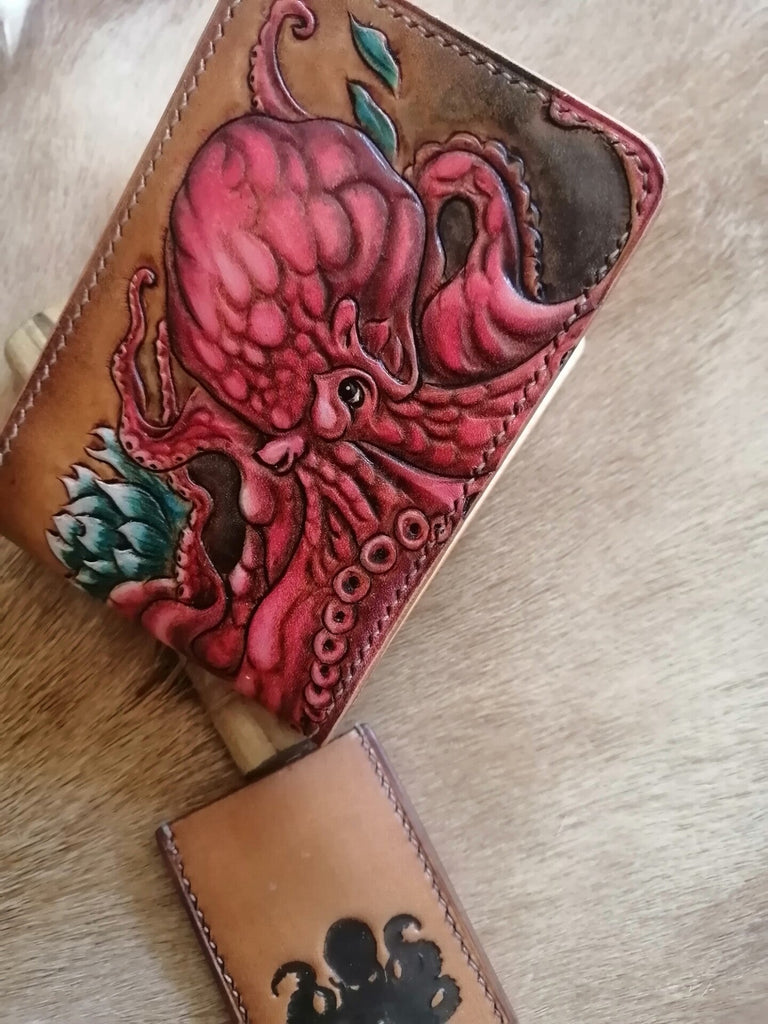 Looking for a minimalist yet bold wallet that makes a statement This hand-carved leather ID window wallet is designed for those who appreciate craftsmanship and unique aesthetics. Featuring a fierce red octopus intricately carved onto the cover, this wallet is both a functional everyday carry and a conversation starter.