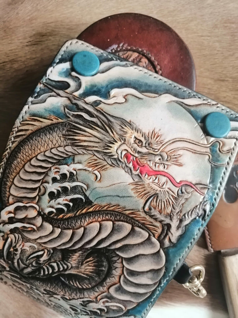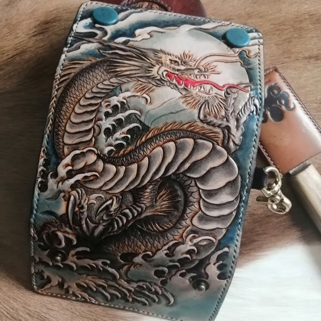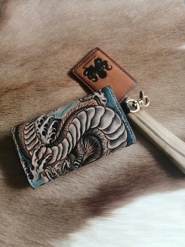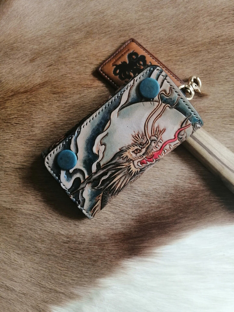 Design: Tooled Leather Key Wallet Key Holders with Card Holder Loong Chinese Dragon Leather Key Wallets