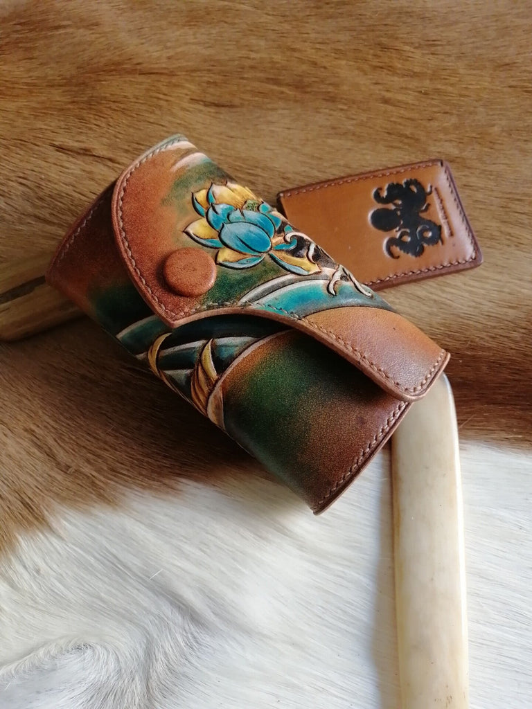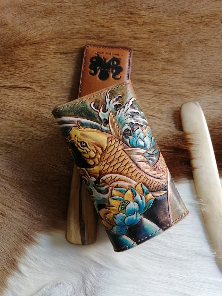 At the heart of its charm is the intricate tooled leather artistry. The surface showcases a vivid yellow carp, a symbol of good fortune and perseverance in many cultures, surrounded by delicately tooled floral motifs. Each detail is painstakingly carved by skilled artisans, bringing the leather to life with rich textures and a three - dimensional allure. The warm, earthy tones of the leather, enhanced by careful dyeing, create a harmonious backdrop for the vibrant yellow carp, making every wallet one - of - a - kind.