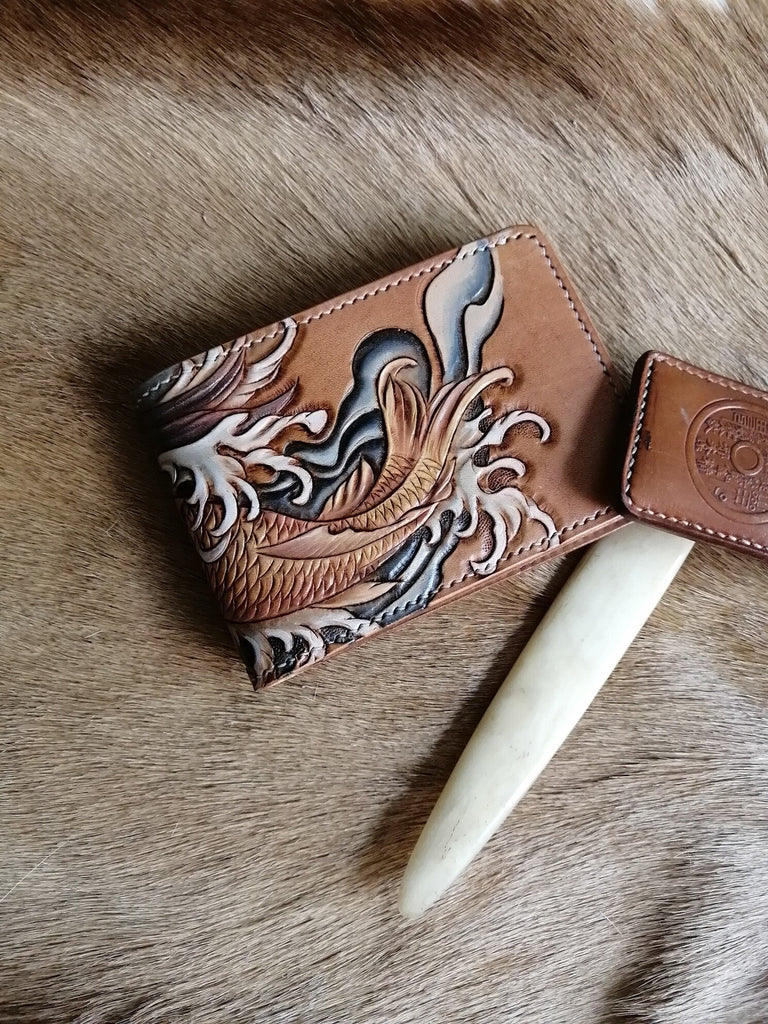 Style: Carp Leather Wallet ID Holder Wallet Mens Wallet with ID Window Carp Wallet Tooled Leather Wallet Card Wallet with ID Window