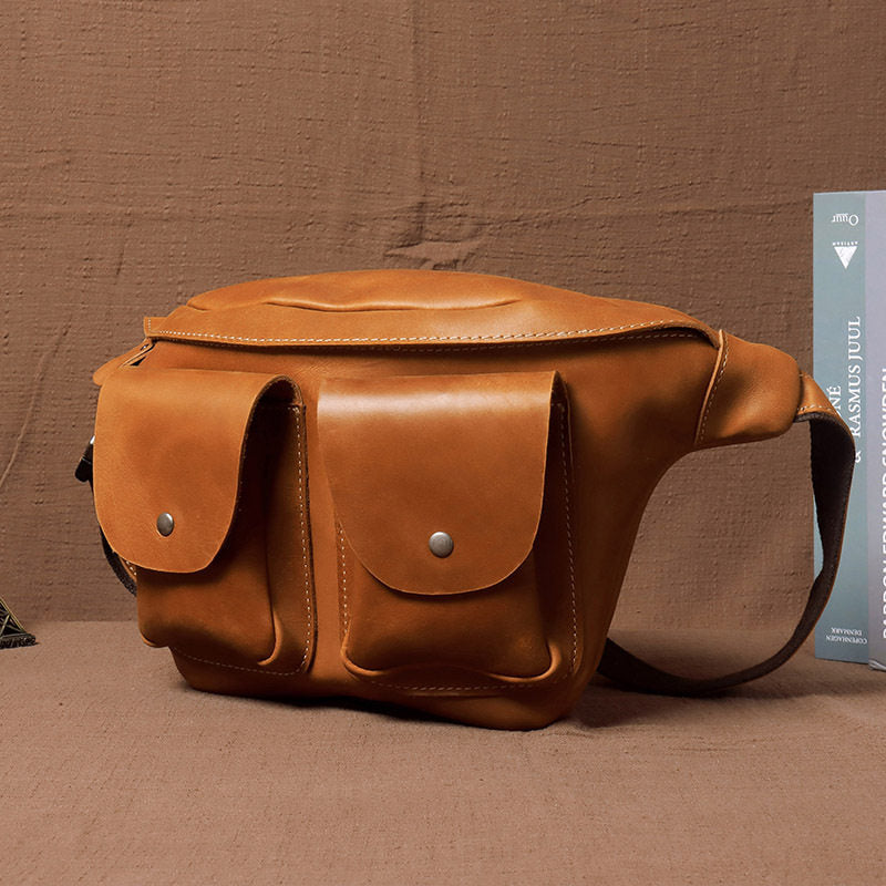 Engineered for security and convenience, this intelligently designed Brown Leather Waist Bag features two front flap pockets for quick access to essentials like your phone, power bank, or smoking accessories. The top-loading main compartment is discreetly hidden for enhanced theft deterrence, while the back includes a zippered security pocket with dedicated slots for your wallet and phone. An additional interior zippered pocket provides extra organization, and the generous capacity can even accommodate an iPad Mini. Wear it around your waist, across your chest, or on your back—this versatile Large Leather Waist Bag adapts to your activity while keeping your belongings secure and within easy reach.