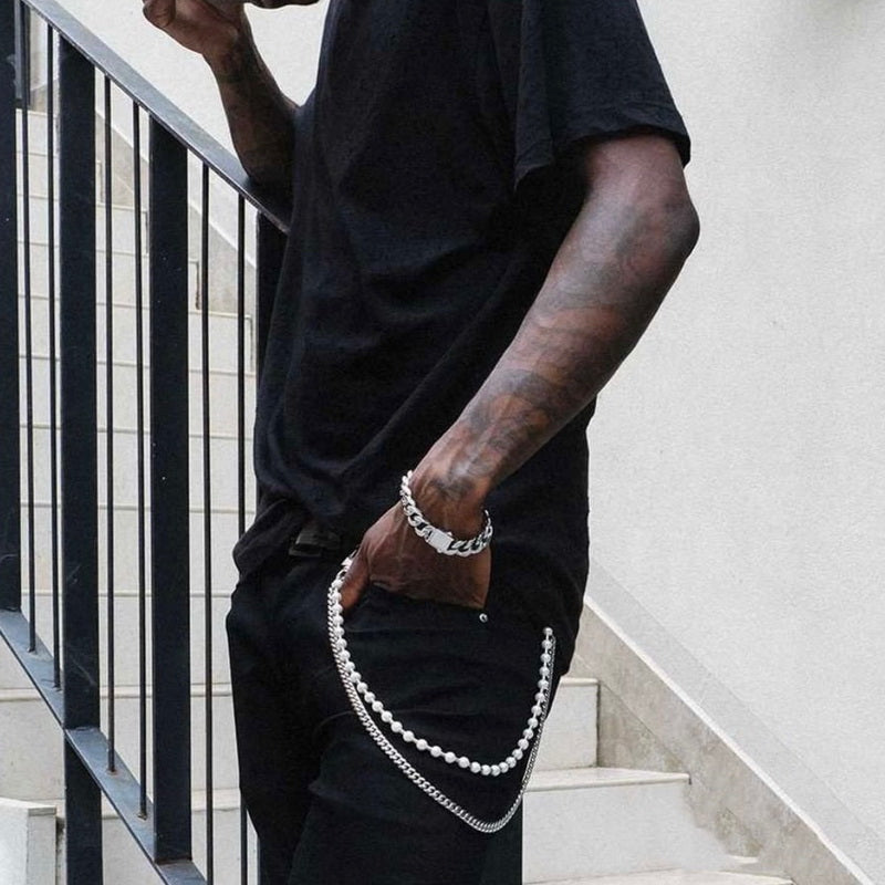 Discover the perfect fusion of femininity and edge with our exquisite Pearl Wallet Chain. This innovative 65cm accessory features a sophisticated double-chain design, combining a strand of luminous glass pearls with a complementary stainless steel chain. This unique Ball Wallet Chain creates a stunning visual harmony between delicate elegance and urban strength, offering a versatile accessory that transitions seamlessly from day to night. The Double Wallet Chain design represents a revolutionary approach to accessory design, blending traditionally masculine aesthetics with feminine grace.