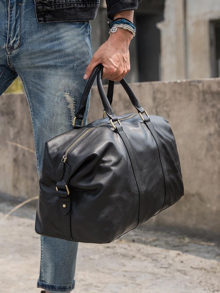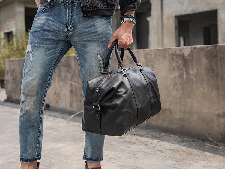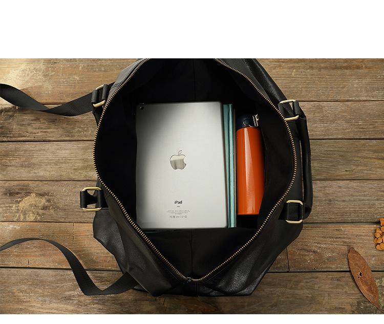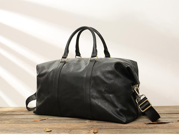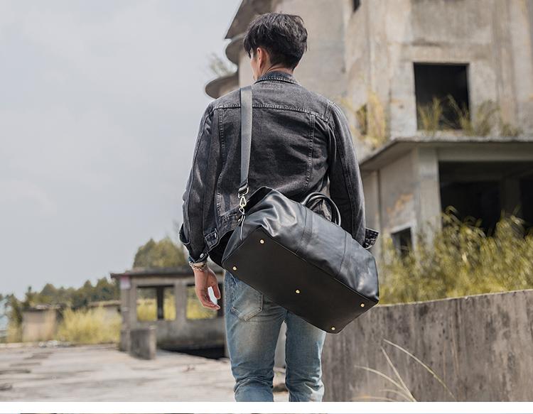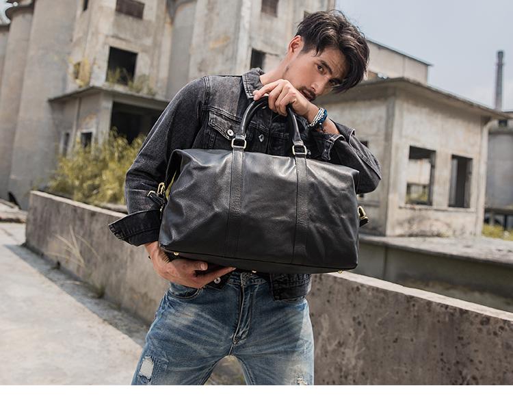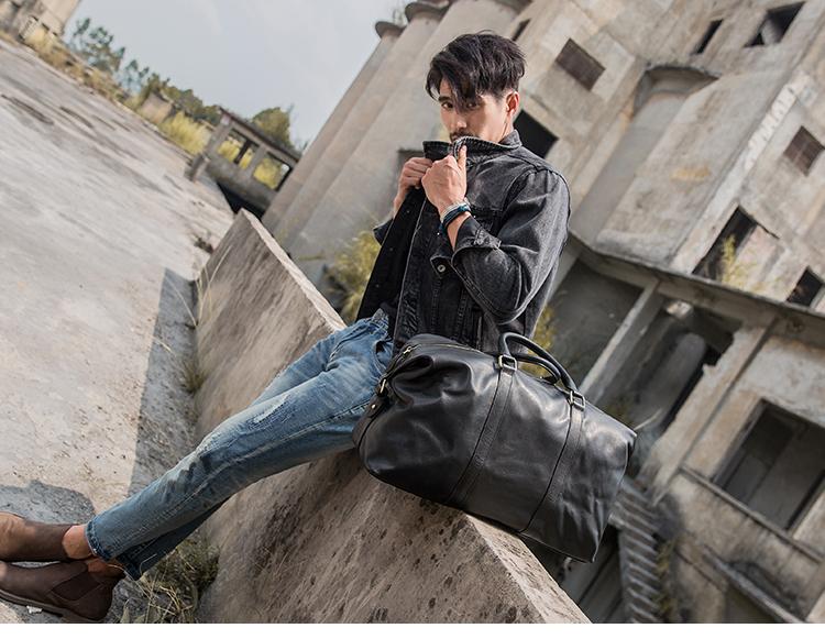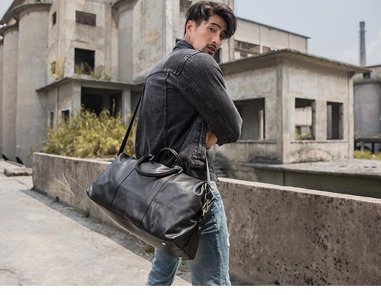 Design: Black Leather Mens 16" Weekender Bag Travel Shoulder Bag Black Luggage Duffle Bag for Men