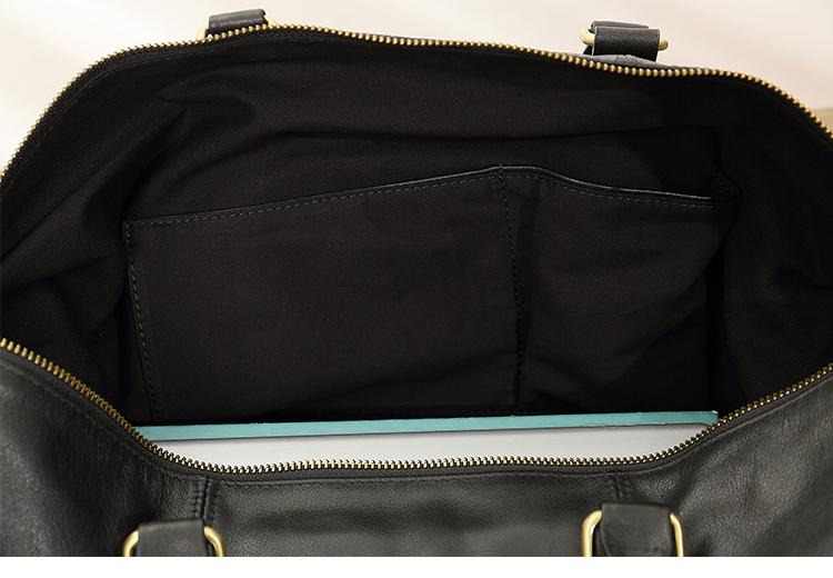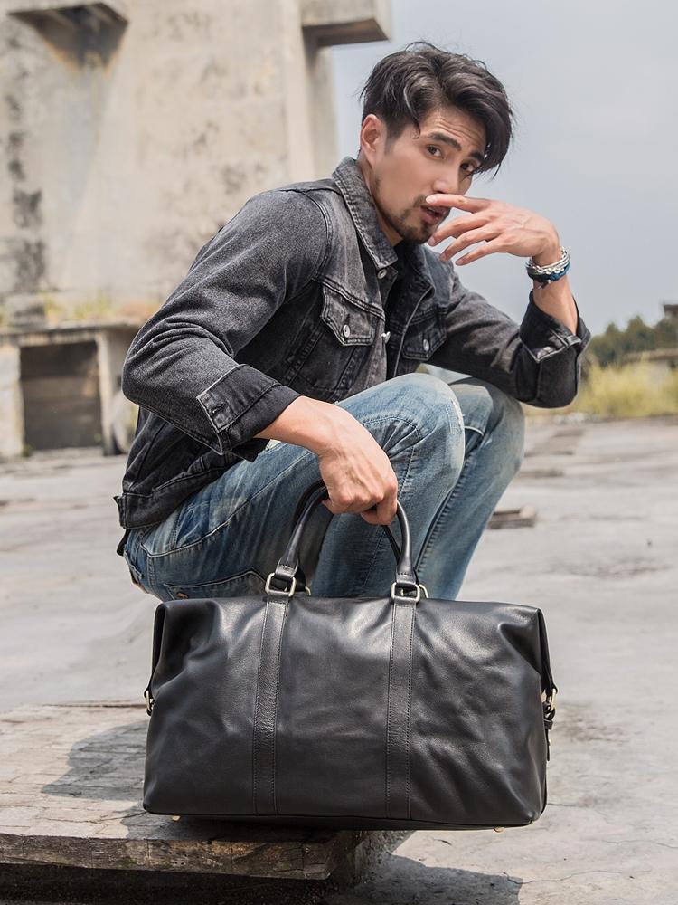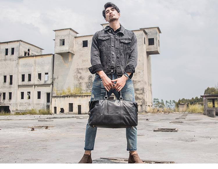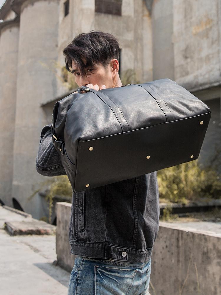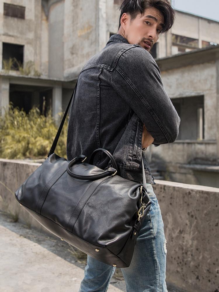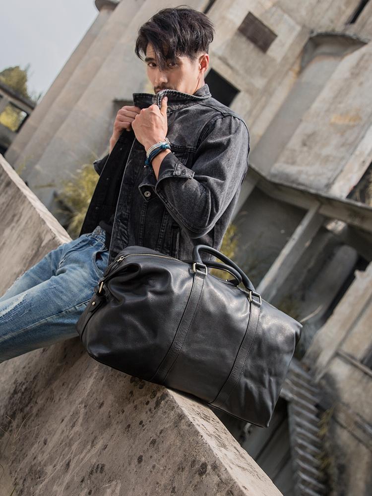 Design: Black Leather Mens 16" Weekender Bag Travel Shoulder Bag Black Luggage Duffle Bag for Men