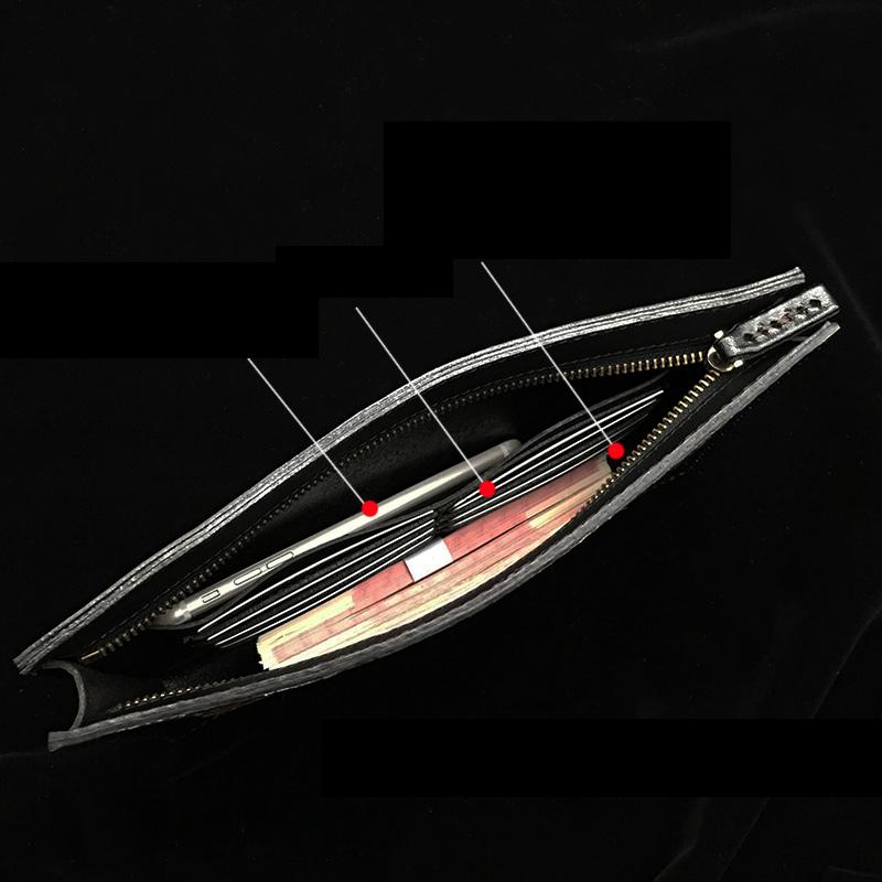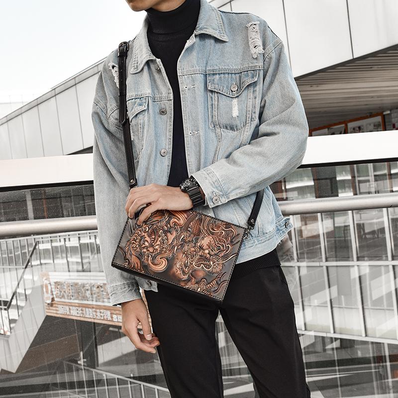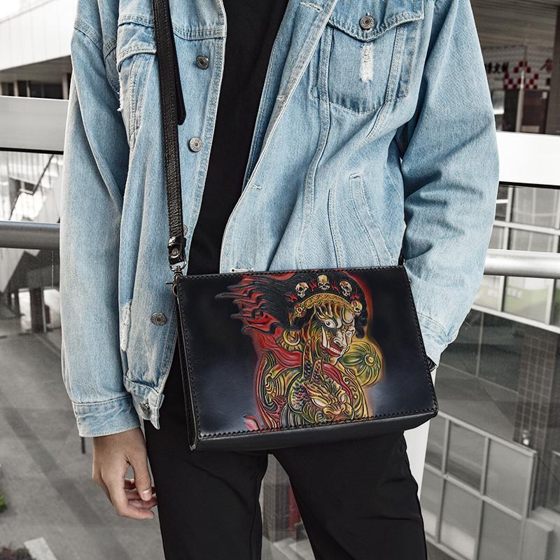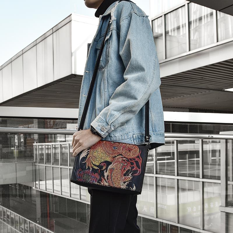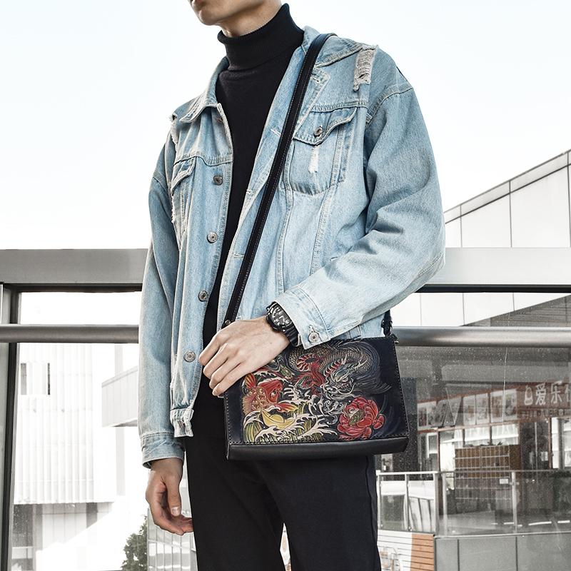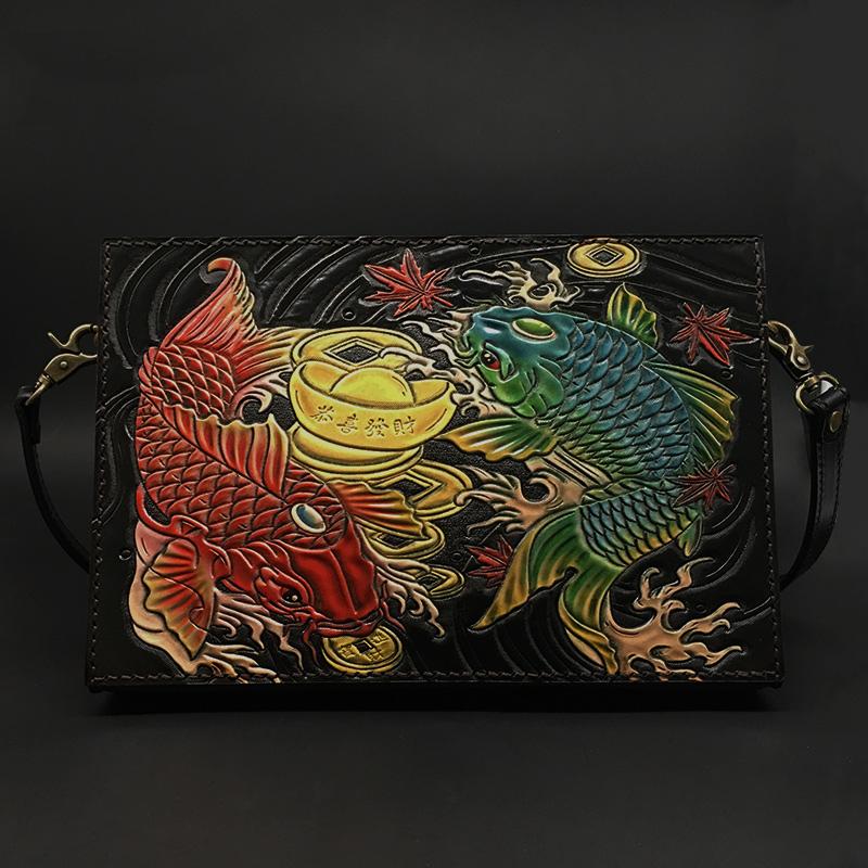 Style: Handmade Black Tooled Double Carp Leather Messenger Bags Side Bag Clutch Wristlet Bag For Men