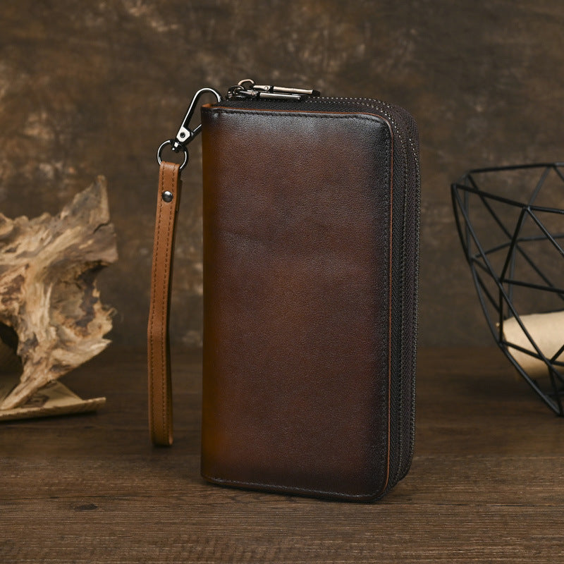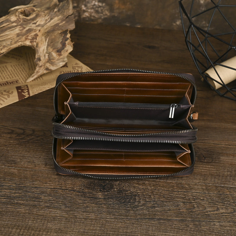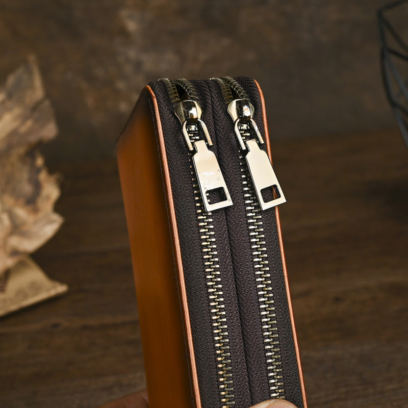 Discover the perfect fusion of rugged functionality and sophisticated organization with our premium Double Zip Around Wallet, expertly crafted for the modern man who demands both ample storage and refined style. This versatile Men's Leather Clutch measures 19.5cm x 9.5cm x 2.5cm, meticulously constructed from 100% full-grain leather in two rich, masculine shades—Classic Brown and Coffee Brown. Featuring a innovative double-zip main compartment with an accordion-style interior, this spacious Double Zip Around Wallet offers impressive capacity with 12 card slots, a secure zippered pocket, and 4 full bill compartments, making it the ideal choice for those who carry substantial daily essentials.