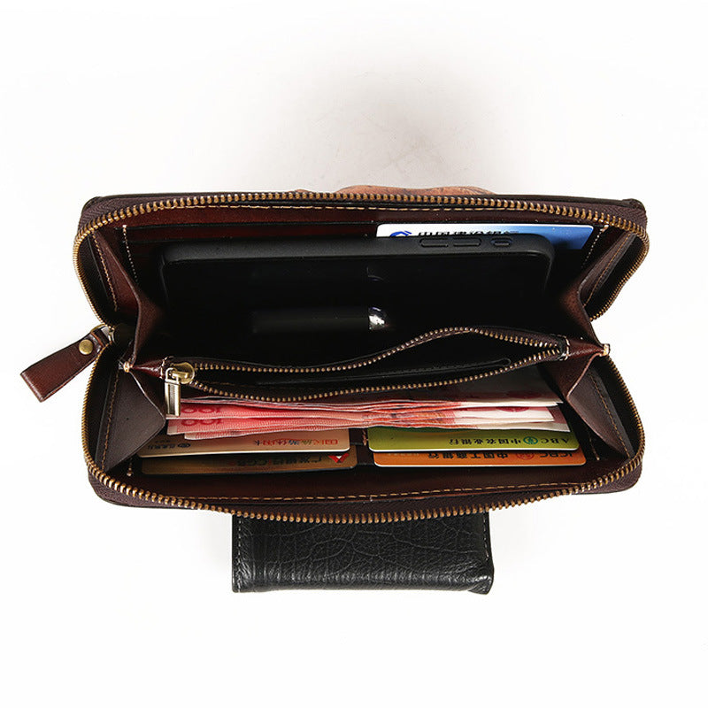 Handmade Black Leather Tooled Relief Skull Long Wallet Cool Skull Zipper Clutch Wristlet Wallet for Men