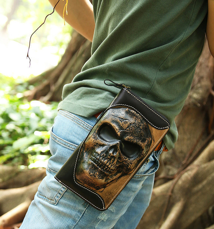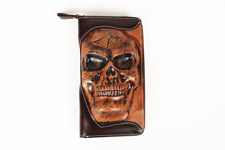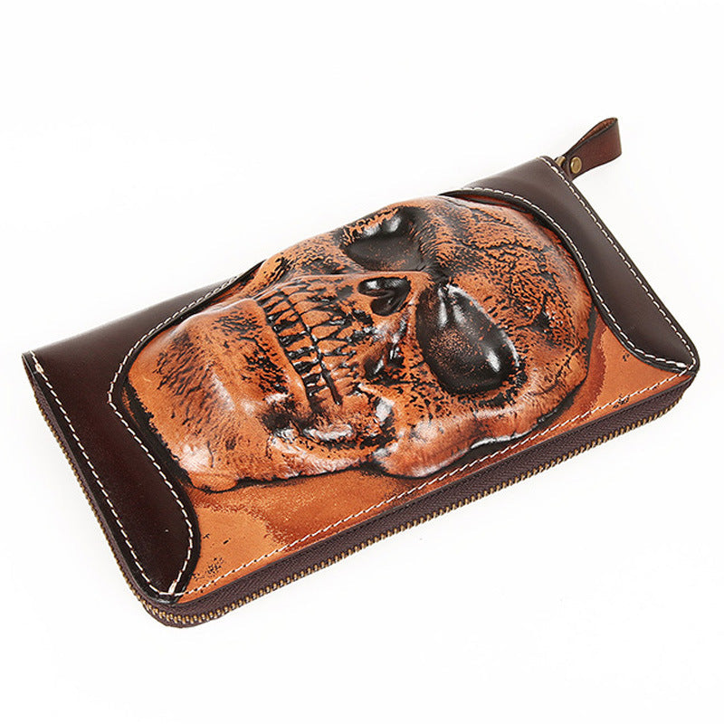 Style: Handmade Leather Tooled Relief Skull Long Wallet Cool Skull Zipper Clutch Wristlet Wallet for Men