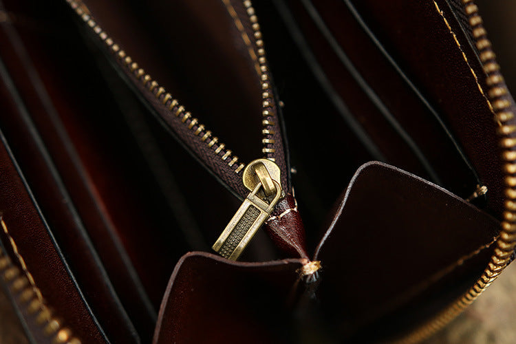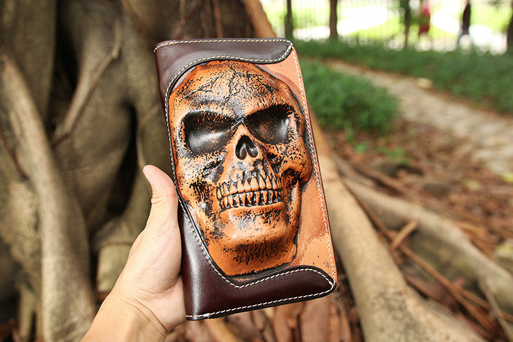 Design: Handmade Leather Tooled Relief Skull Long Wallet Cool Skull Zipper Clutch Wristlet Wallet for Men