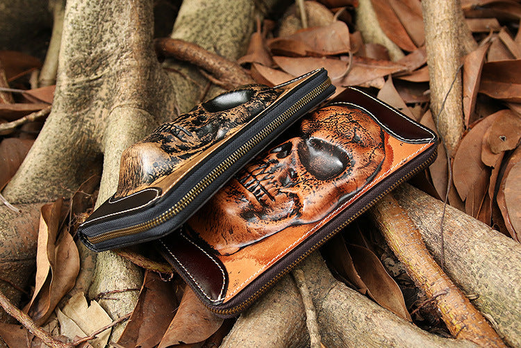 Design: Handmade Leather Tooled Relief Skull Long Wallet Cool Skull Zipper Clutch Wristlet Wallet for Men