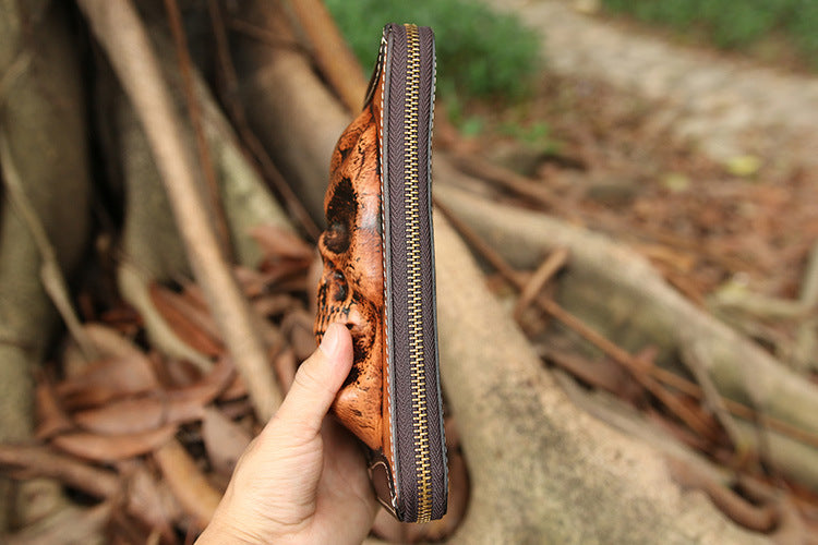 Style: Handmade Leather Tooled Relief Skull Long Wallet Cool Skull Zipper Clutch Wristlet Wallet for Men