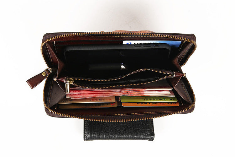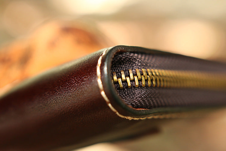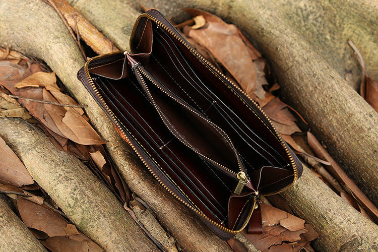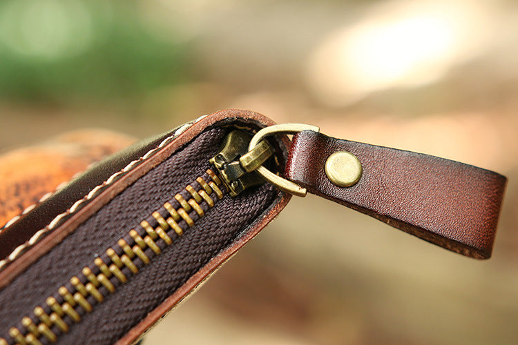 Handmade Coffee Leather Tooled Relief Skull Long Wallet Cool Skull Zipper Clutch Wristlet Wallet for Men