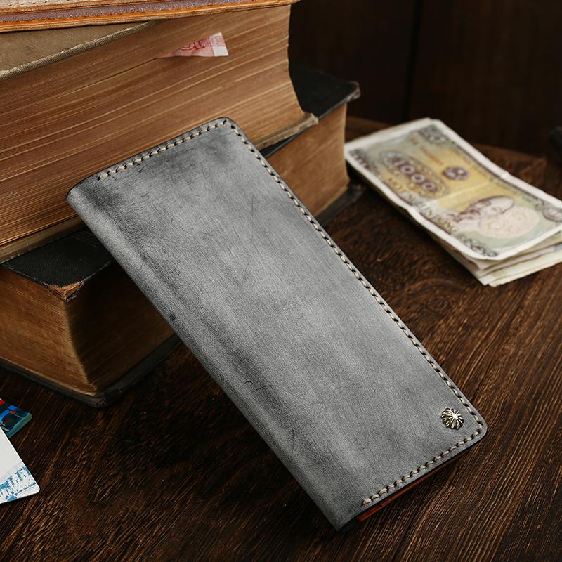 Style: Simple Handmade Mens Brown Slim Long Wallet Blue Bifold Card Wallet Clutch Wallet For Men