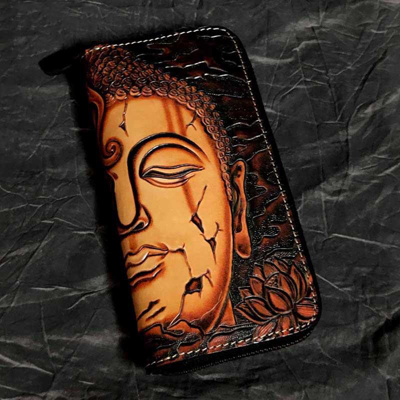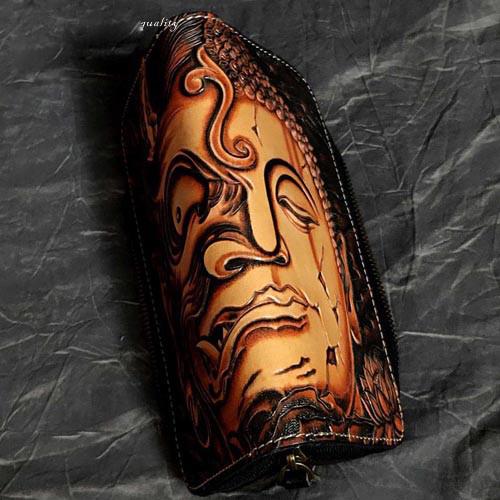 Design: Badass Black Leather Men's Long Biker Handmade Wallet Black Buddha Tooled Zipper Long Wallets For Men