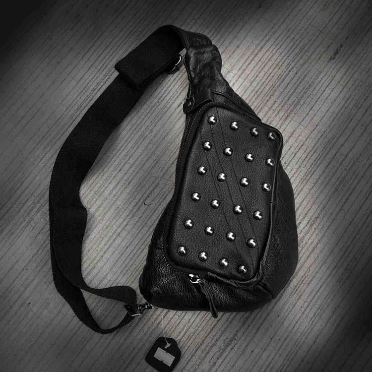 Style: Badass Black Leather Men's Sling Bag Chest Bag One shoulder Backpack Phone Bag For Men