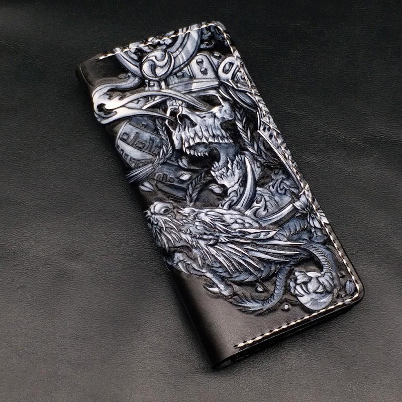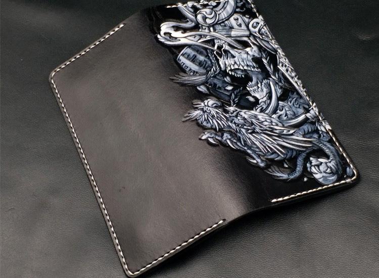 Style: Black Handmade Tooled Indian Chief Skull Leather Mens Long Wallet Bifold Long Wallet For Men