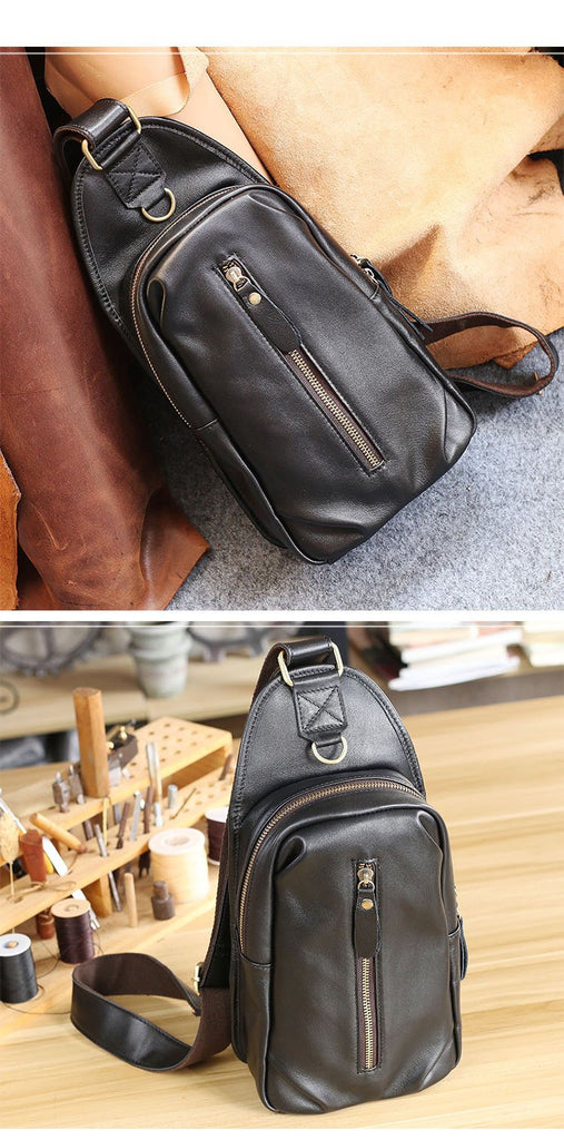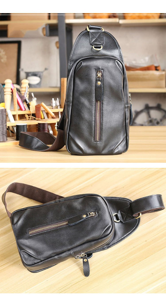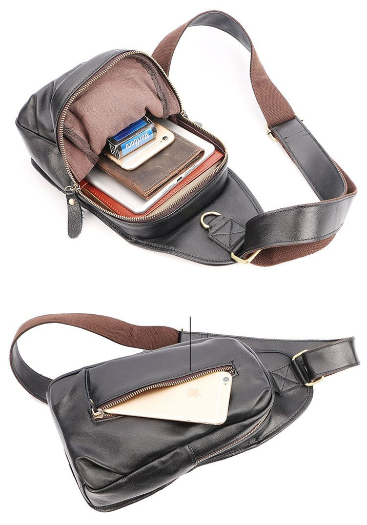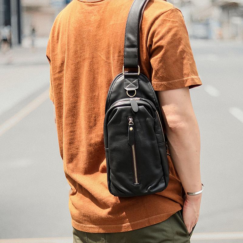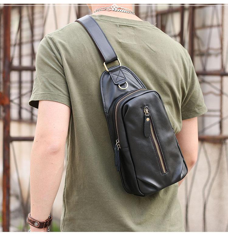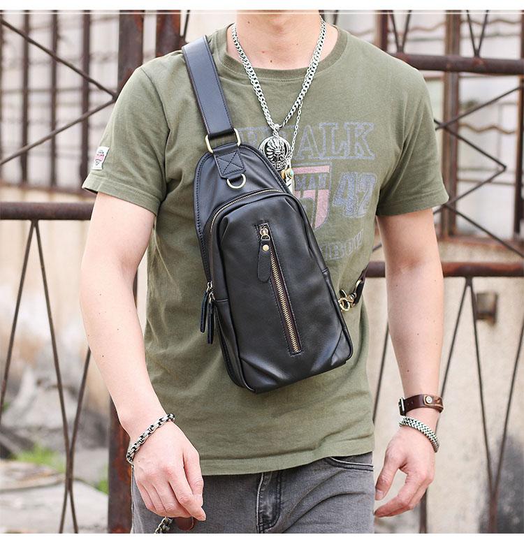 Design: Black Cool Leather Mens Chest Bag Shoulder Bag Messenger Bag For Men