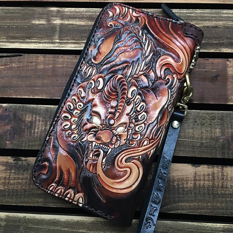 Style: Black Handmade Tooled Chinese Dragon Leather Long Biker Wallet Chain Wallet Clutch Wallet For Men