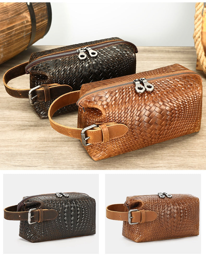 Design: Braided Pattern Leather Toiletry Bag Men's Brown Leather Toiletry Bag Full Grain Leather Toiletry Bag