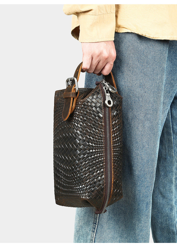 Style: Braided Pattern Leather Toiletry Bag Men's Brown Leather Toiletry Bag Full Grain Leather Toiletry Bag
