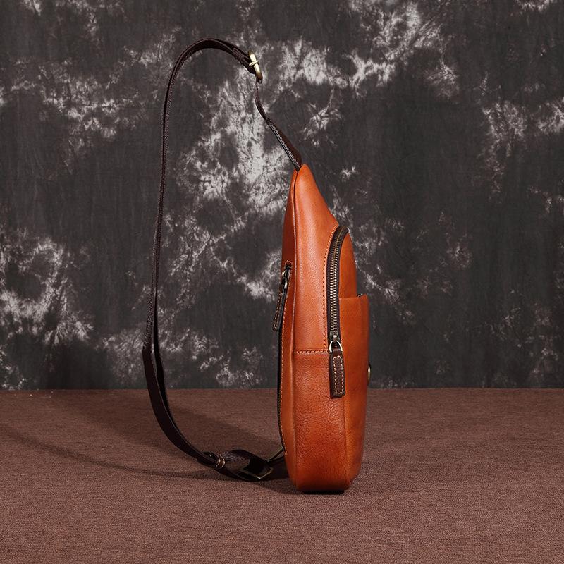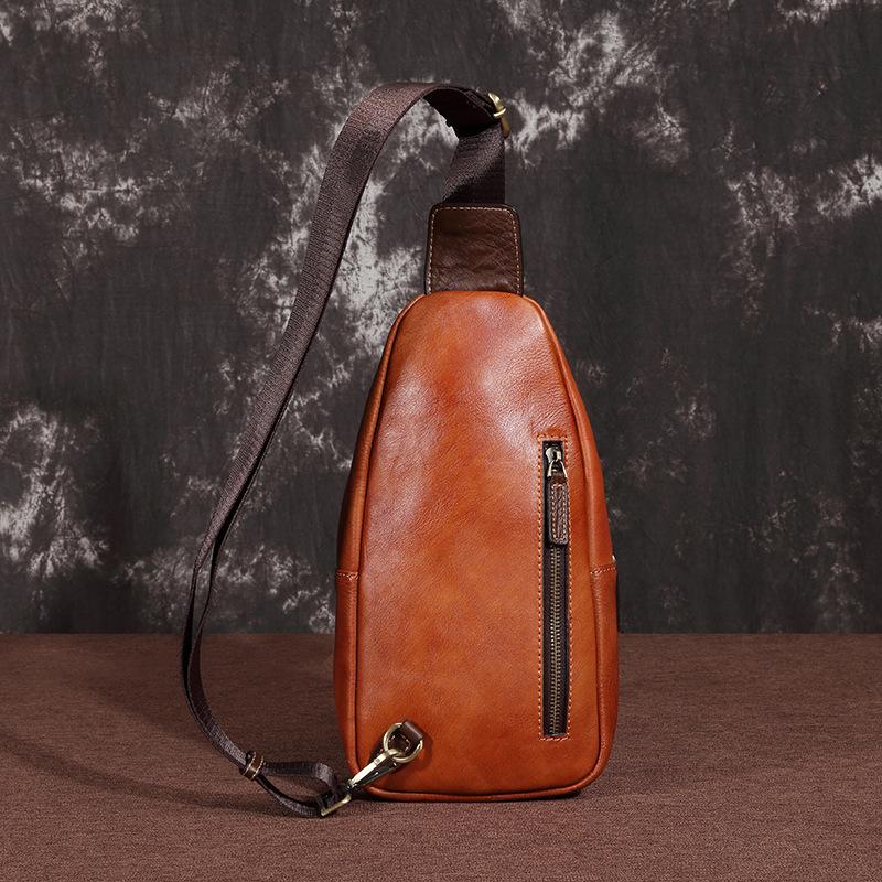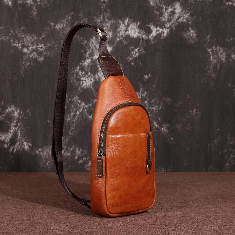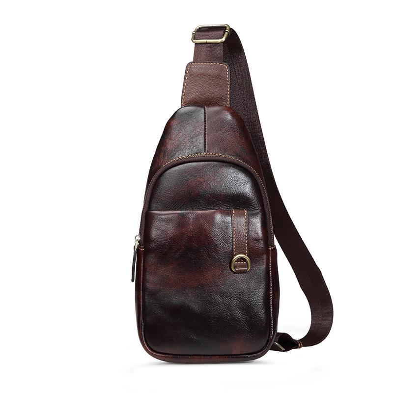 Style: Brown Cool LEATHER MENS 8 inches Sling Bag One Shoulder Backpack Dark Brown Chest Bag For Men