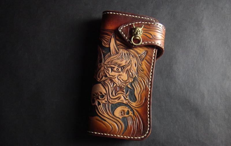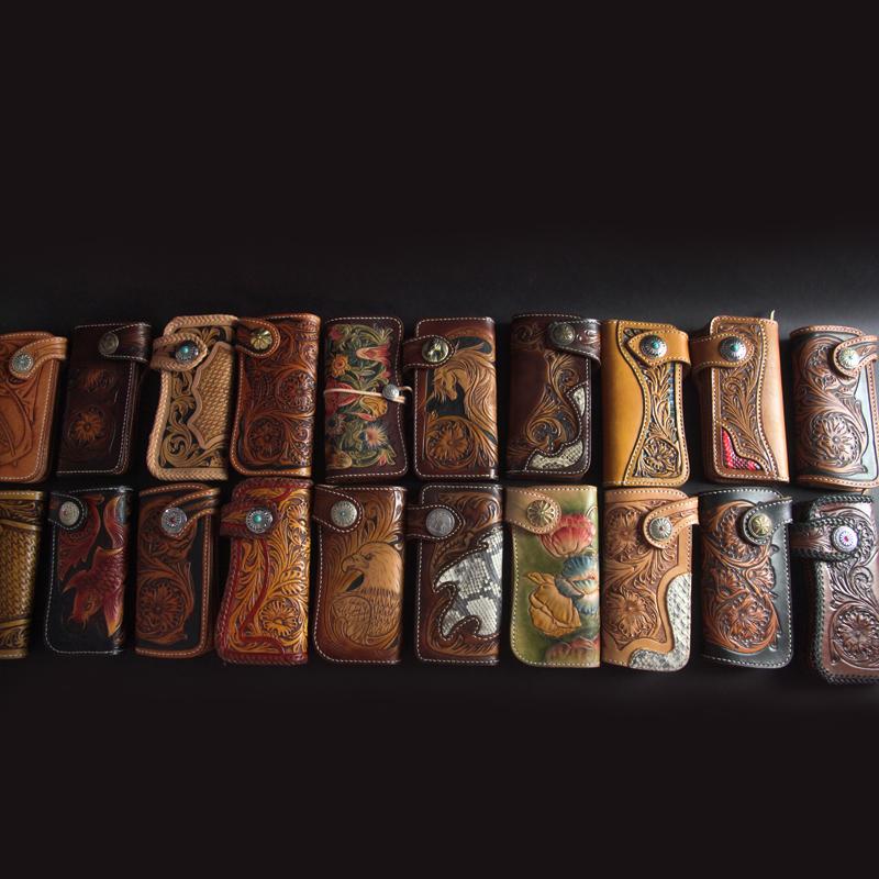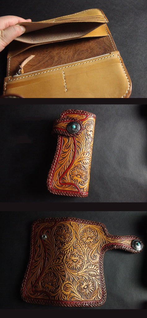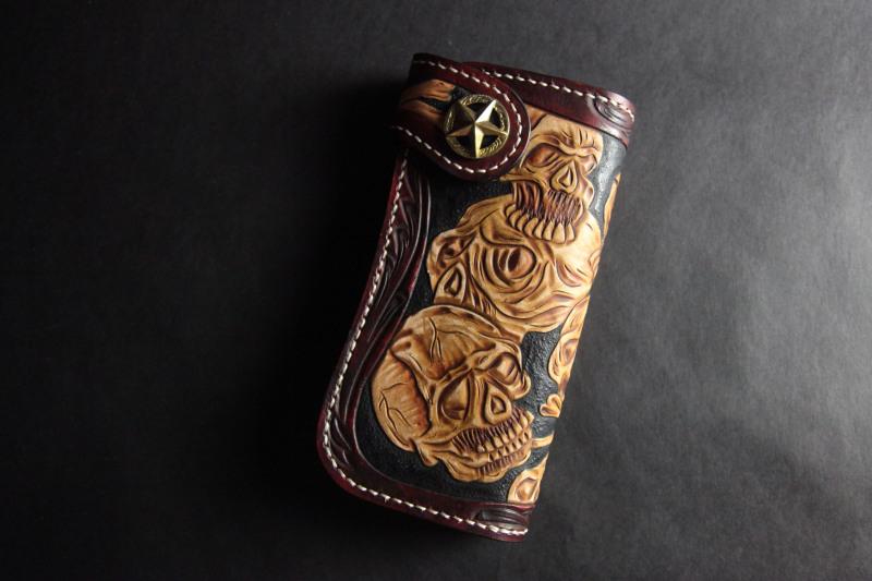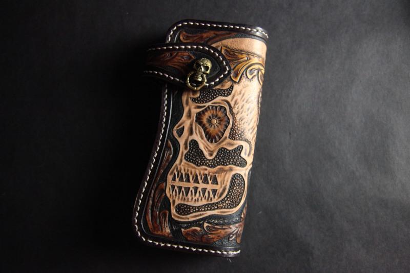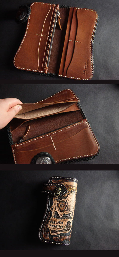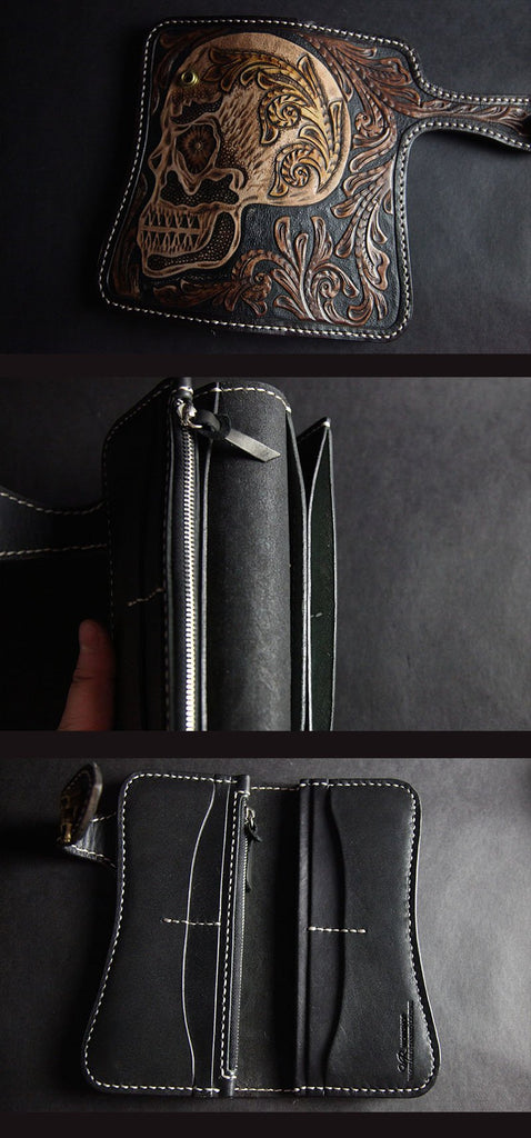 Style: Handmade Skull Tooled Black Leather Mens Long Biker Wallet Biker Chain Wallet For Men