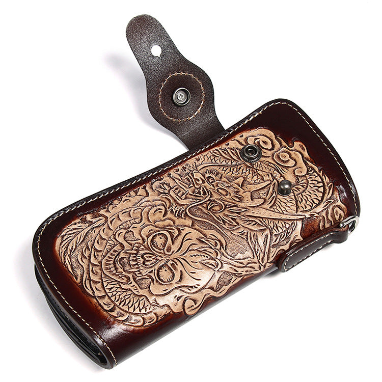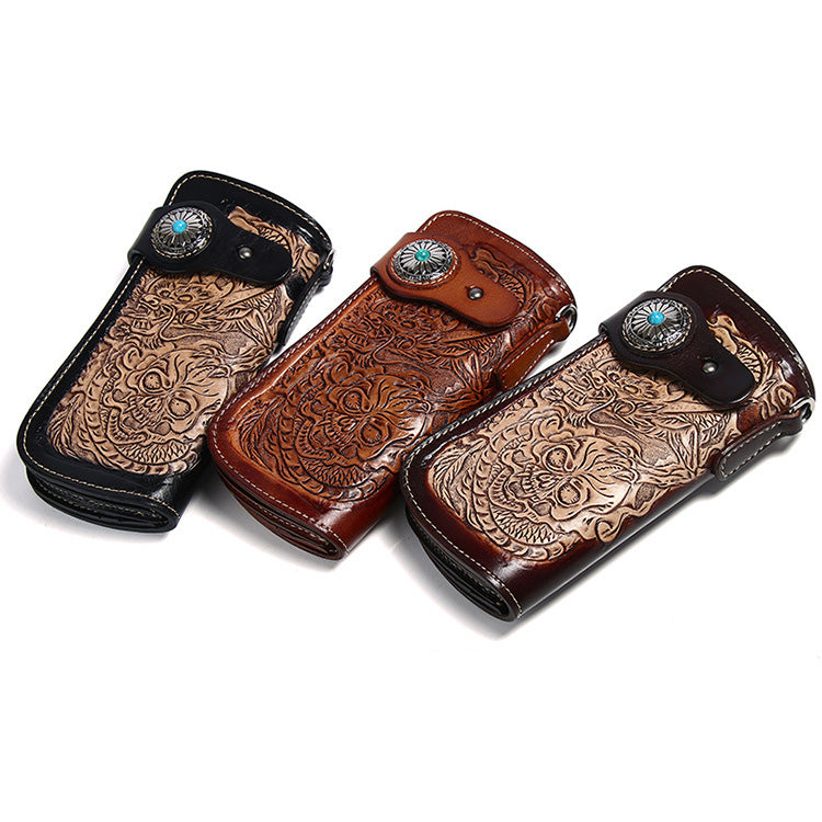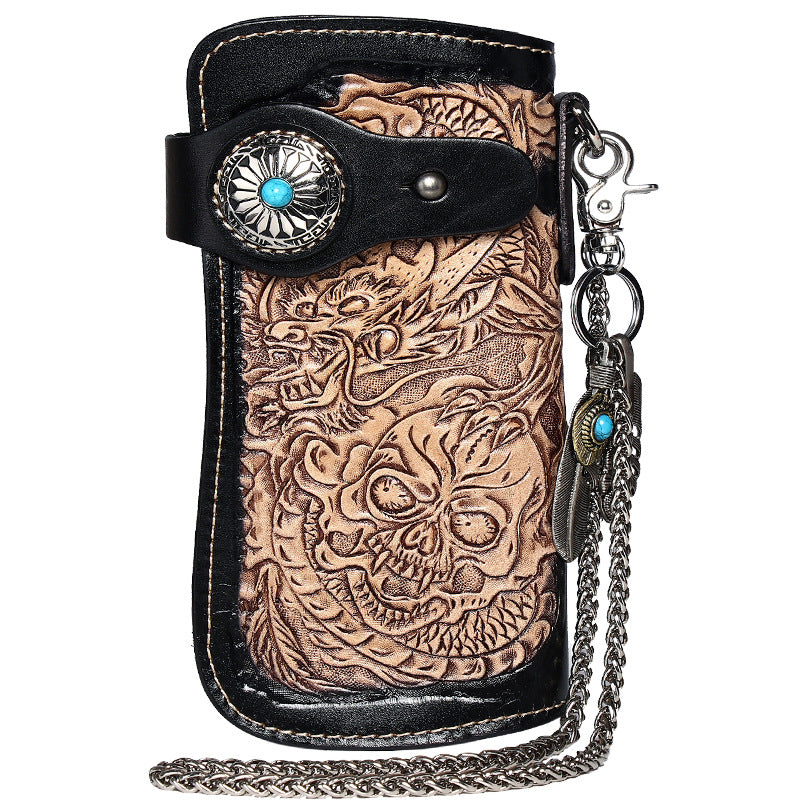 Style: Cool Leather Tooled Dragon&Skull Biker Wallet Handmade Biker Chain Wallet for Men
